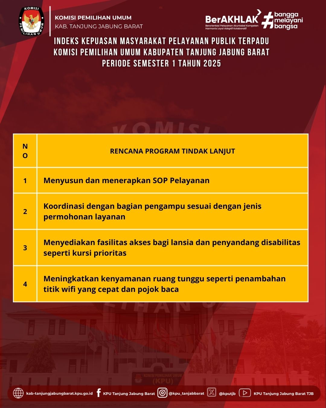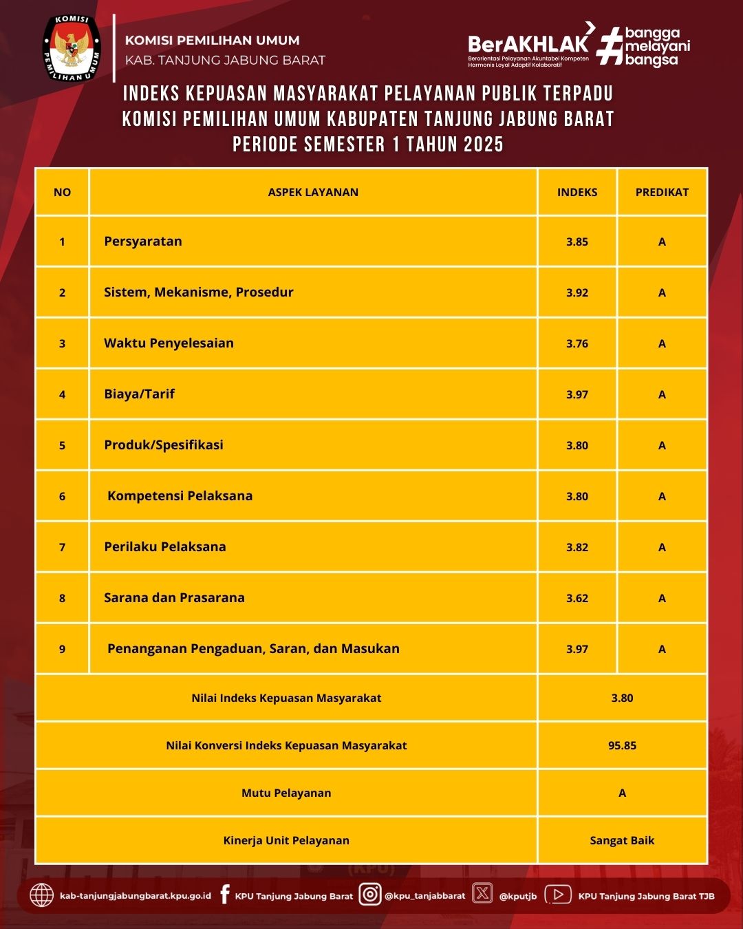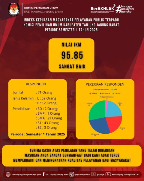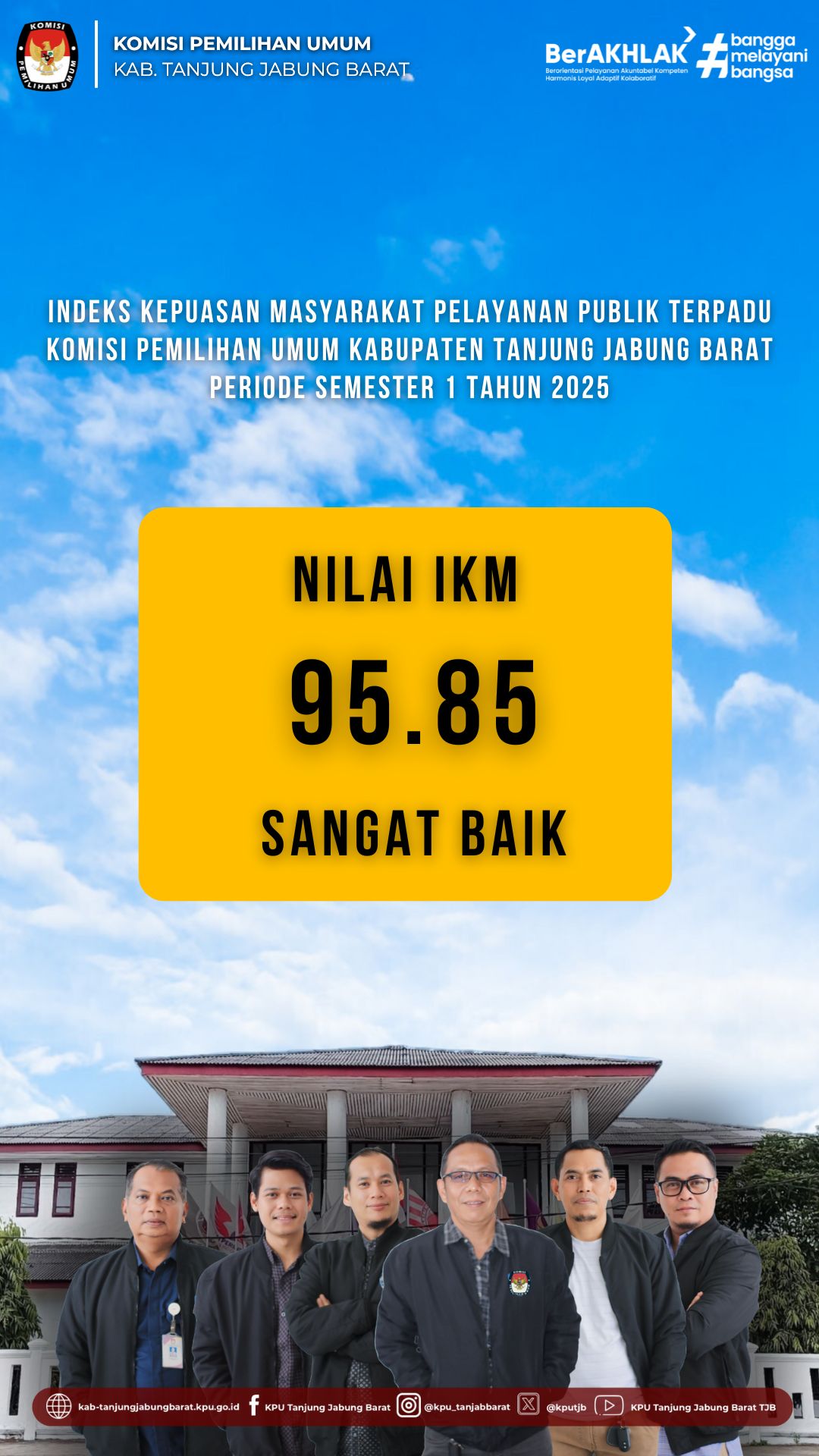 #temanpemilih KPU Kabupaten Tanjung Jabung Barat Mengucapkan, Terima kasih atas kepercayaan dan partisipasi #TemanPemilih telah memberikan penilaian Survei Kepuasaan Masyarakat (SKM) Pelayanan Publik Terpadu Komisi Pemilihan Umum Kabupaten Tanjung Jabung Barat (KPU Periode Juli-Agustus 2025 sehingga memperoleh penilaian IKM 95,85 atau Sangat Baik.