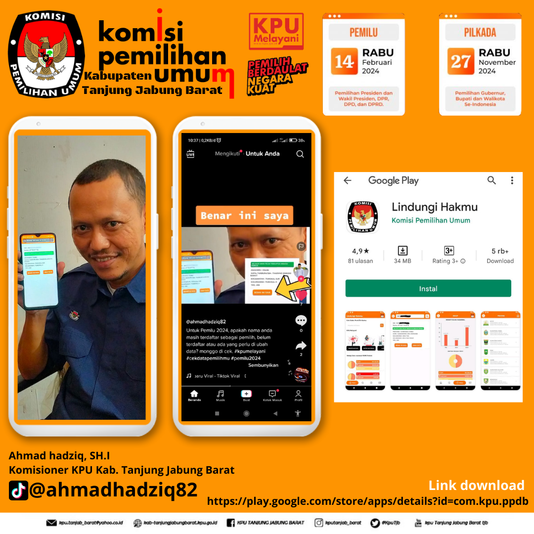 terkait dengan itu, Ahmad Hadziq Komisioner KPU Kabupaten Tanjung Jabung Barat selaku Divisi Perencanaan data dan informasi telah mengunggah di Akun TikTok ( https://vt.tiktok.com/ZSdYxvQvg/ ) Pribadinya tentang tatacara penggunan Aplikasi LINDUNGI HAKMU dan menuliskan caption '' Untuk Pemilu 2024, apkah nama anda masih terdaftar sebagai Pemilih, belum terdaftar atau ada yang perlu di ubah data? monggo di cek''.