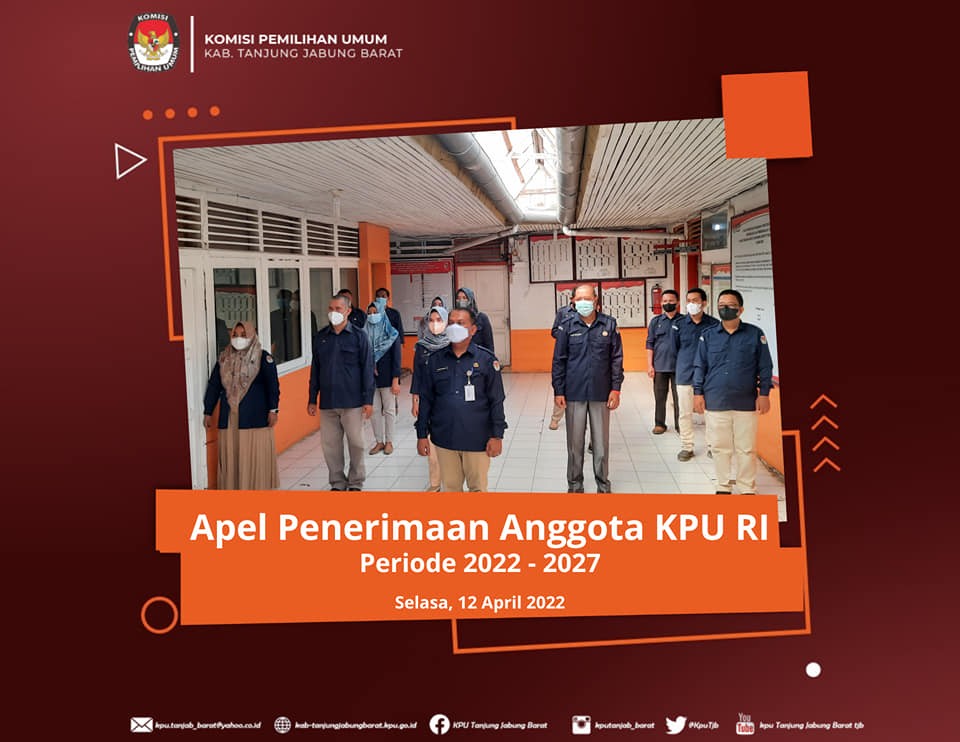 Pada kesempatan tersebut KPU Kabupaten Tanjung Jabung Barat berkesempatan berpartisipasi dalam Momentum Apel Penerimaan Anggota KPU RI 2022-2027 Sesuai Surat Sekjen Nomor : 492/PK.02.1-Und/03/2022 tentang Apel Penerimaan Anggota KPU RI Periode 2022-2027, Sekretariat KPU Kabupaten Tanjung Jabung Barat mengikuti Apel Penerimaan Anggota KPU RI 2022-2027 di Halaman KPU Kabupaten Tanjung Jabung Barat pukul 14.30 WIB s/d Selesai yang dilaksanakan Oleh KPU Republik Indonesia Via Daring dengan Media Zoom Meeting dan Kanal Youtube KPU RI.