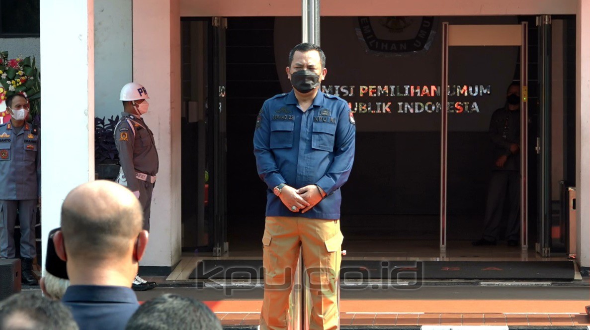 Sekjen KPU RI Bernad Dermawan Sutrisno yang bertindak sebagai Pimpinan Apel kemudian menyampaikan laporan kepada Anggota KPU RI Periode 2022-2027. “Lapor, 14.197 pegawai Sekretariat Jenderal, Sekretariat KPU Provinsi, dan Sekretariat Kab/Kota yang tersebar di 549 satker dalam satu manajemen kepegawaian siap menerima arahan dan mendukung tugas-tugas KPU Periode 2022-2027 dalam penyiapan dan pelaksanaan Pemilu dan Pilkada Tahun 2024, laporan selesai,” ujar Bernad.