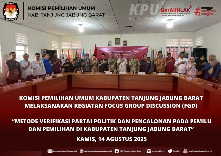 #TemanPemilih Komisi Pemilihan Umum (KPU) Kabupaten Tanjung Jabung Barat menggelar Focus Group Discussion (FGD) bertema 'Metode Verifikasi Partai Politik dan Pencalonan Pemilu dan Pemilihan' yang membahas prosedur, tantangan, dan solusi untuk memastikan proses pencalonan dan verifikasi parpol berjalan sesuai regulasi.