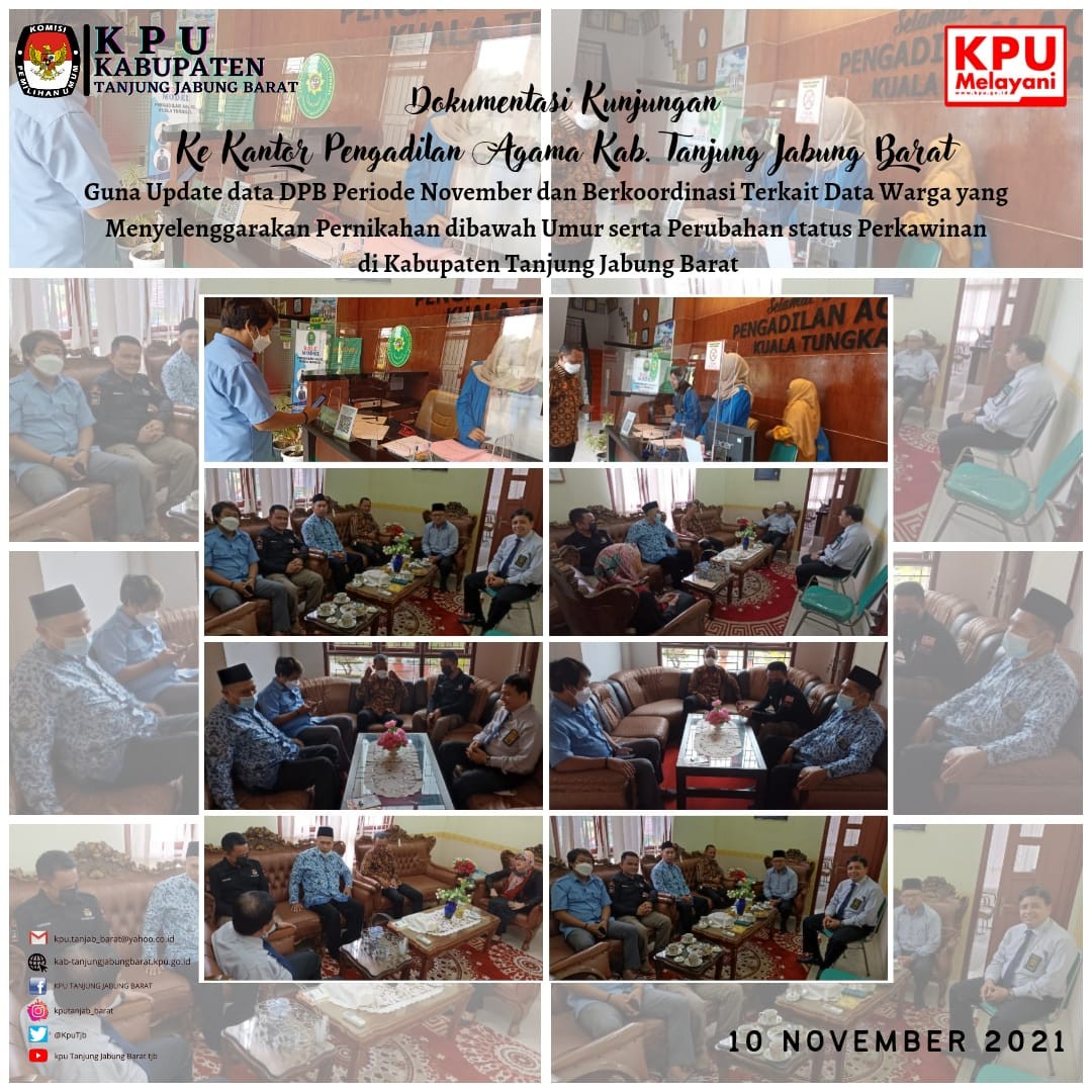 AHMAD HADZIQ, S.HI Selaku Kadiv Program dan Data KPU Tanjab Barat dan MUHAMMAD AMIN, SH Sub koordinator Program dan Data KPU Tanjab Barat berserta SARWANI, SE dan Operator SIDALIH, mengunjungi kantor Pengadilan Agama Kuala Tungkal, guna progres update data DPB Periodenya Bulan NOVEMBER Tahun 2021, Sehubungan dengan itu Komisi Pemilihan Umum Tanjung Jabung Barat sedang melaksanakan Pemuktakhiran Daftar Pemilih Berkelanjutan (DPB) Tahun 2021 di Kabupaten Tanjung Jabung Barat dan Penginputan Data Daftar Pemilih Berkelanjutan pada Sistem SIDALIH Komisi Pemilihan Umum Republik Indonesia, maka AHMAD HADZIQ, S.HI Selaku Kadiv Program dan Data memandang penting berkoordinasi dengan Pengadilan Agama Kuala Tungkal terkait data warga yang 'menyelenggarakan Pernikahan dibawah umur dan perubahan status perkawinan akibat percerian' di Kab. Tanjung Jabung Barat yang di terima khusus di Ruang Kerja Ketua Pengadilan Agama Kuala Tungkal Zakaria Ansori, SHI, MH. dan turut menyambut Wakil Ketua Sri Rizki Dwi Putri, S.H., M.H. Beserta Ghozi, S.Ag.M.H.selaku Panitera Pengadilan.