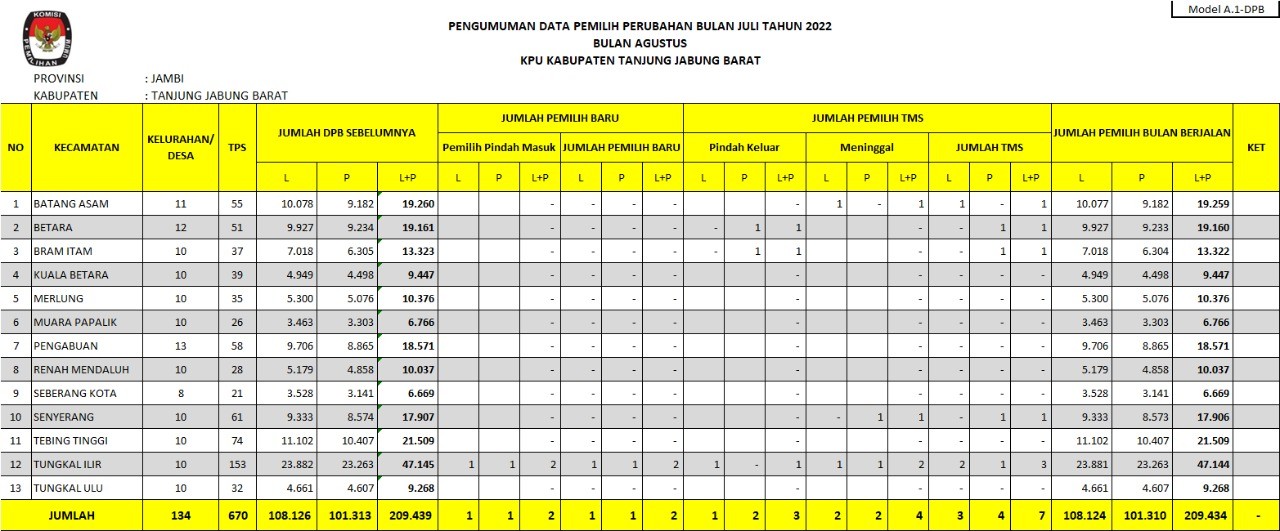 Berdasarkan ketentuan Peraturan Komisi Pemilihan Umum Nomor 6 tanggal 11 bulan November tahun 2021 perihal Pemutakhiran Data Pemilih Berkelanjutan, hasil Rapat Pleno yang dilakukan oleh KPU Kabupaten Tanjung Jabung Barat menghasilkan hal sebagai berikut, yaitu;