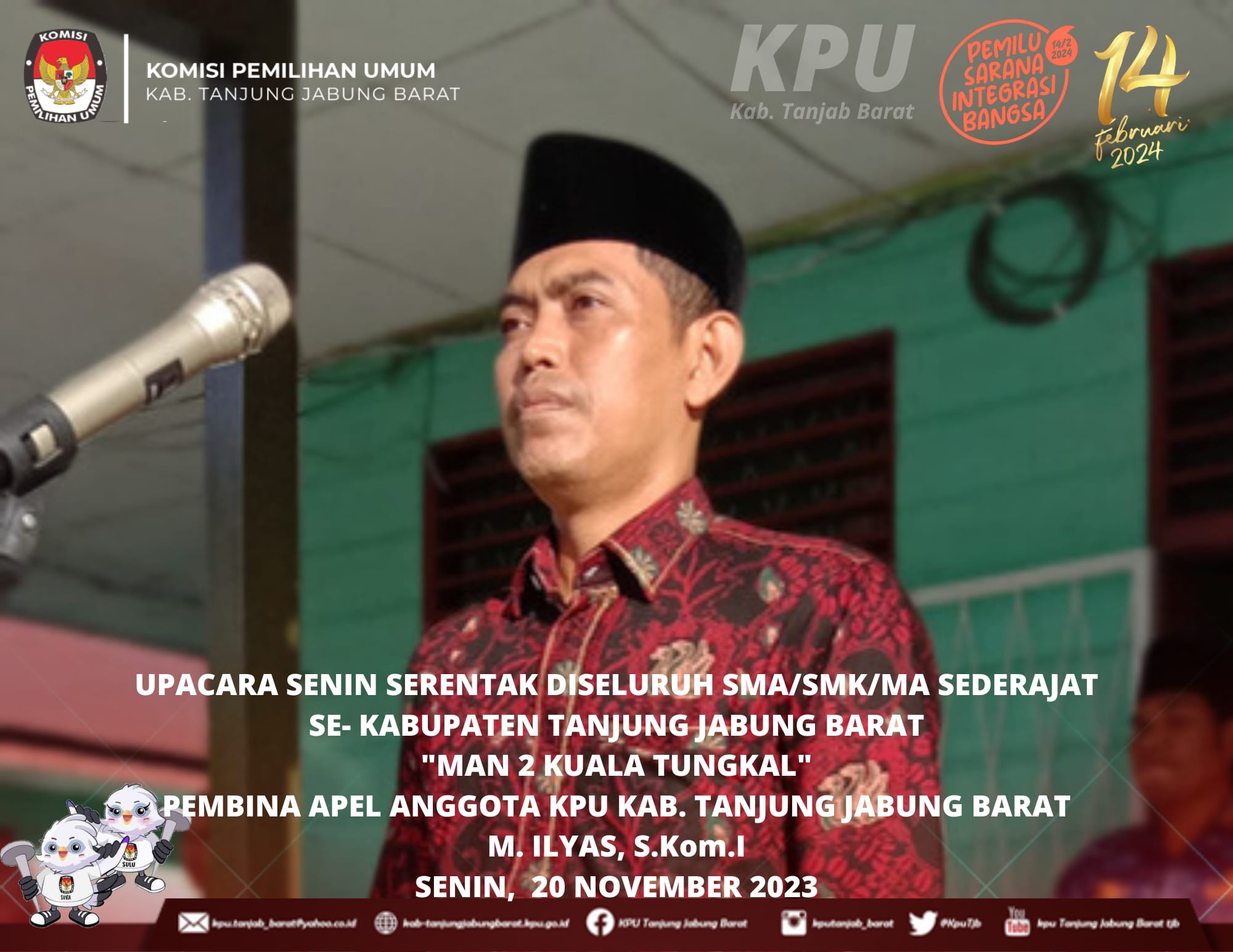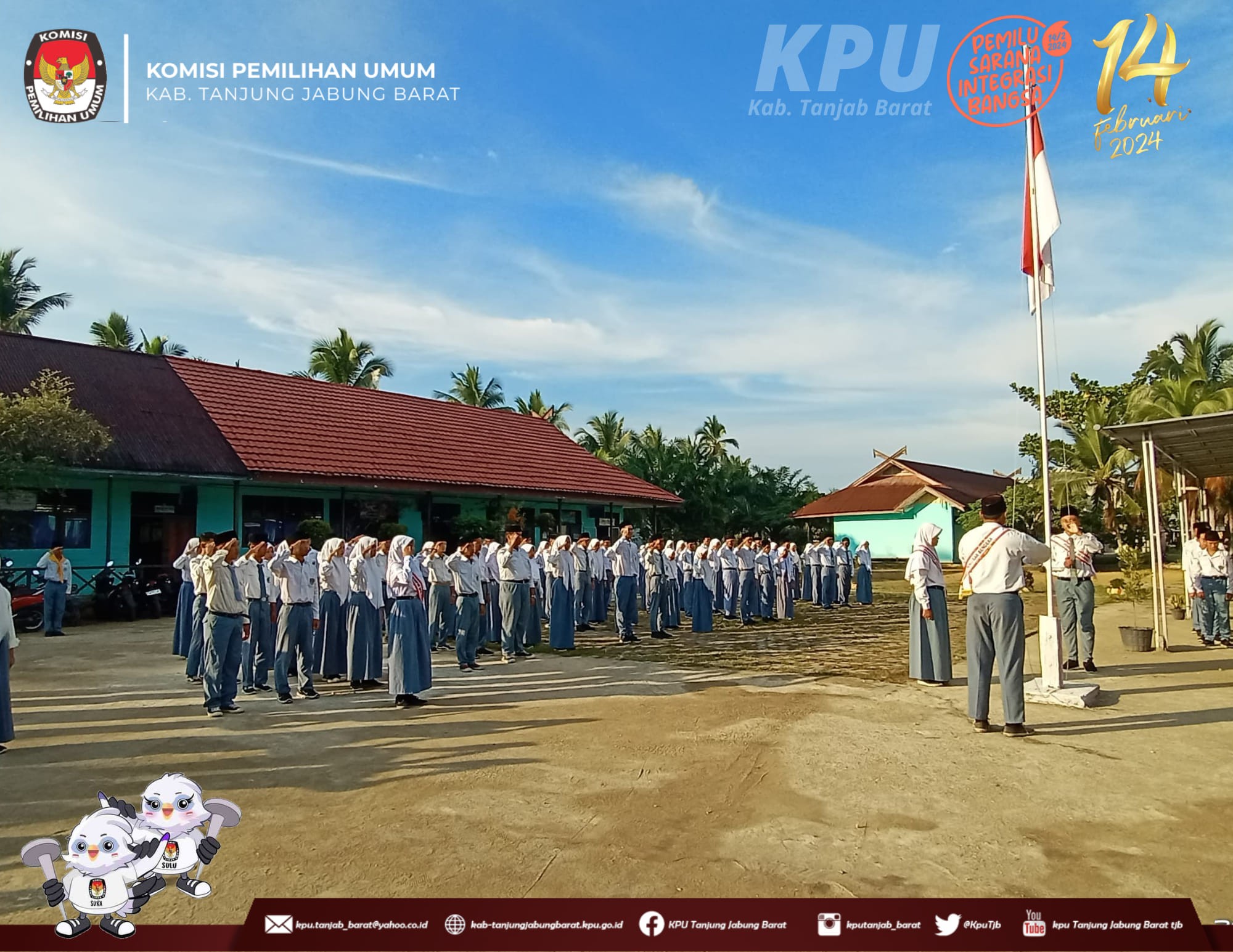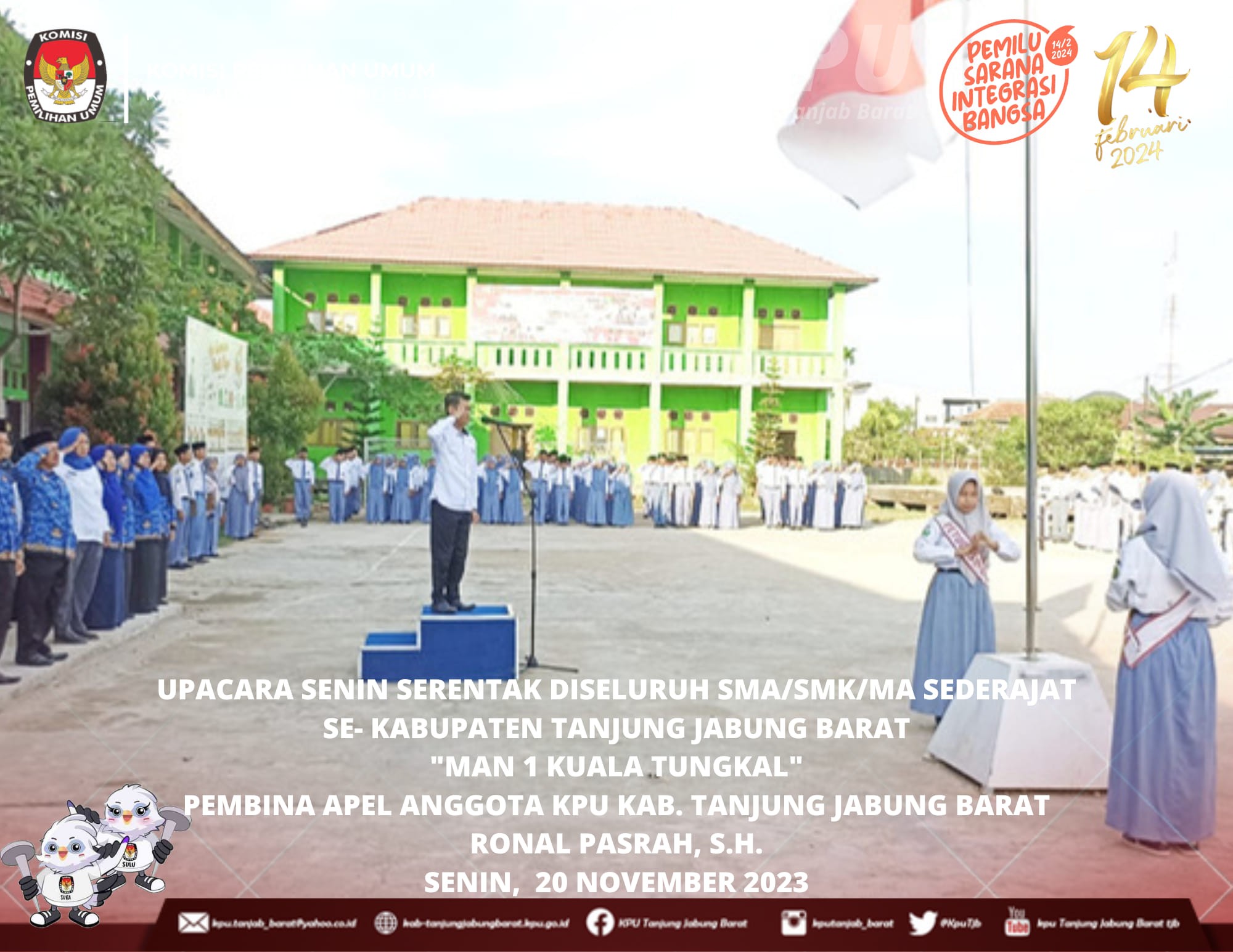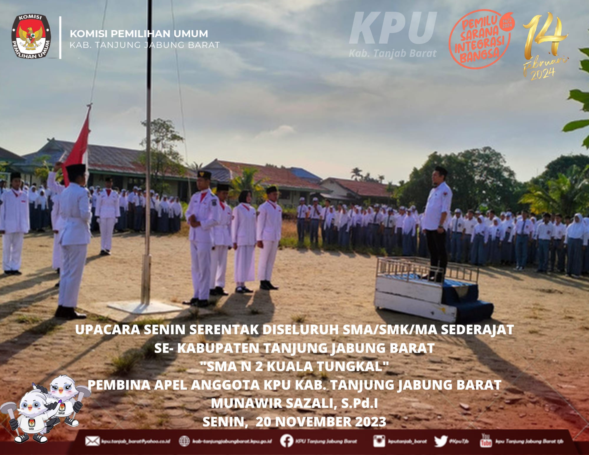 Menindaklanjuti Surat Edaran Sekretaris Jenderal Komisi Pemilihan Umum Nomor 11 Tahun 2023 tentang Optimalisasi Pelaksanaan Sosialisasi untuk meningkatkan Partisipasi Masyarakat dalam Penyelenggaraan Pemilu Tahun 2024, Serta Menindaklanjuti Surat Komisi Pemilihan Umum Provinsi Jambi Nomor : 944/PP.06/15/2023 Tanggal 3 November 2023 Perihal Optimalisasi Kegiatan Sosialisasi disekolah Anggota KPU Kabupaten Tanjung Jabung Barat melaksanakan Upacara Senin, 20 November 2023 di sekolah di Kabupaten tanjung Jabung Barat