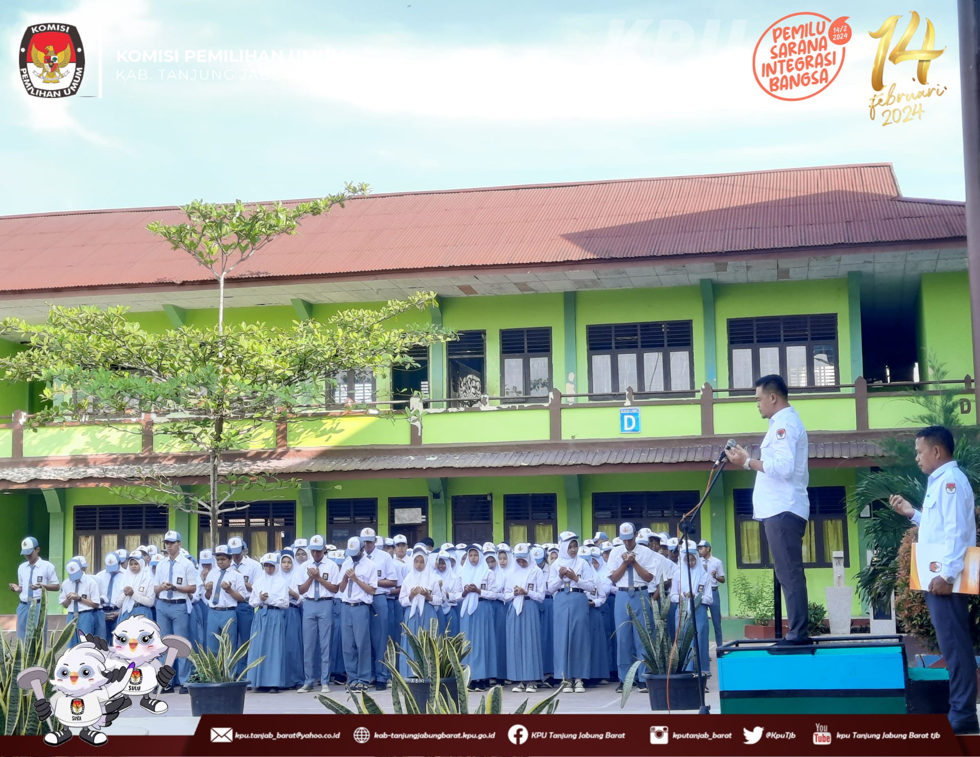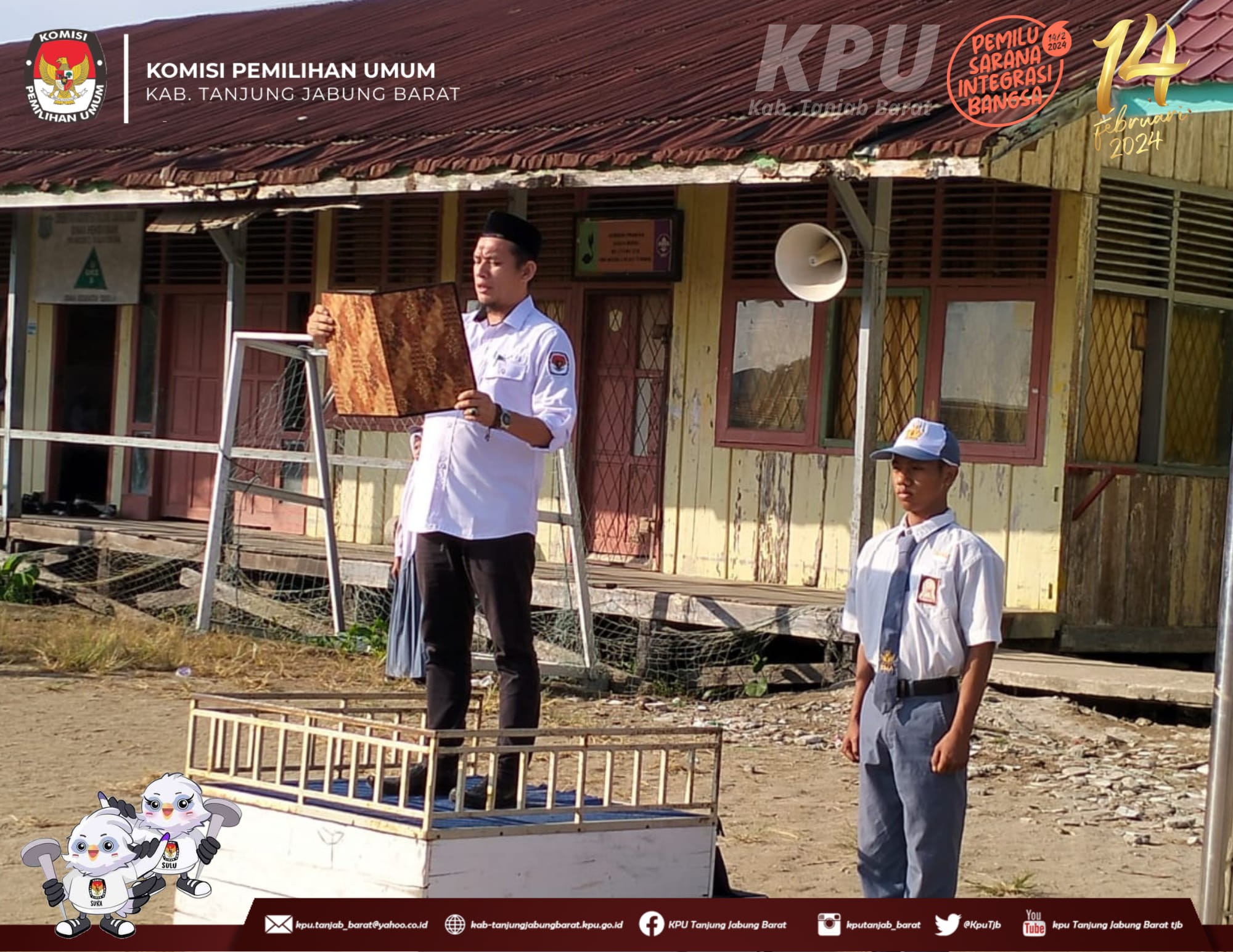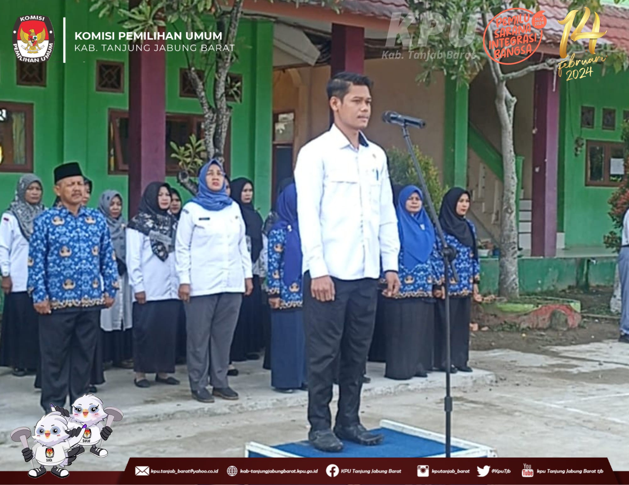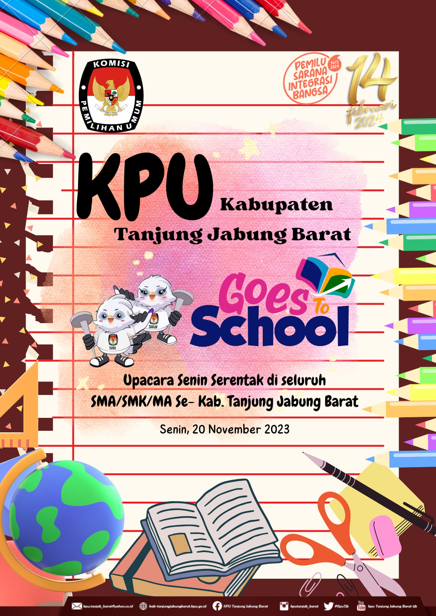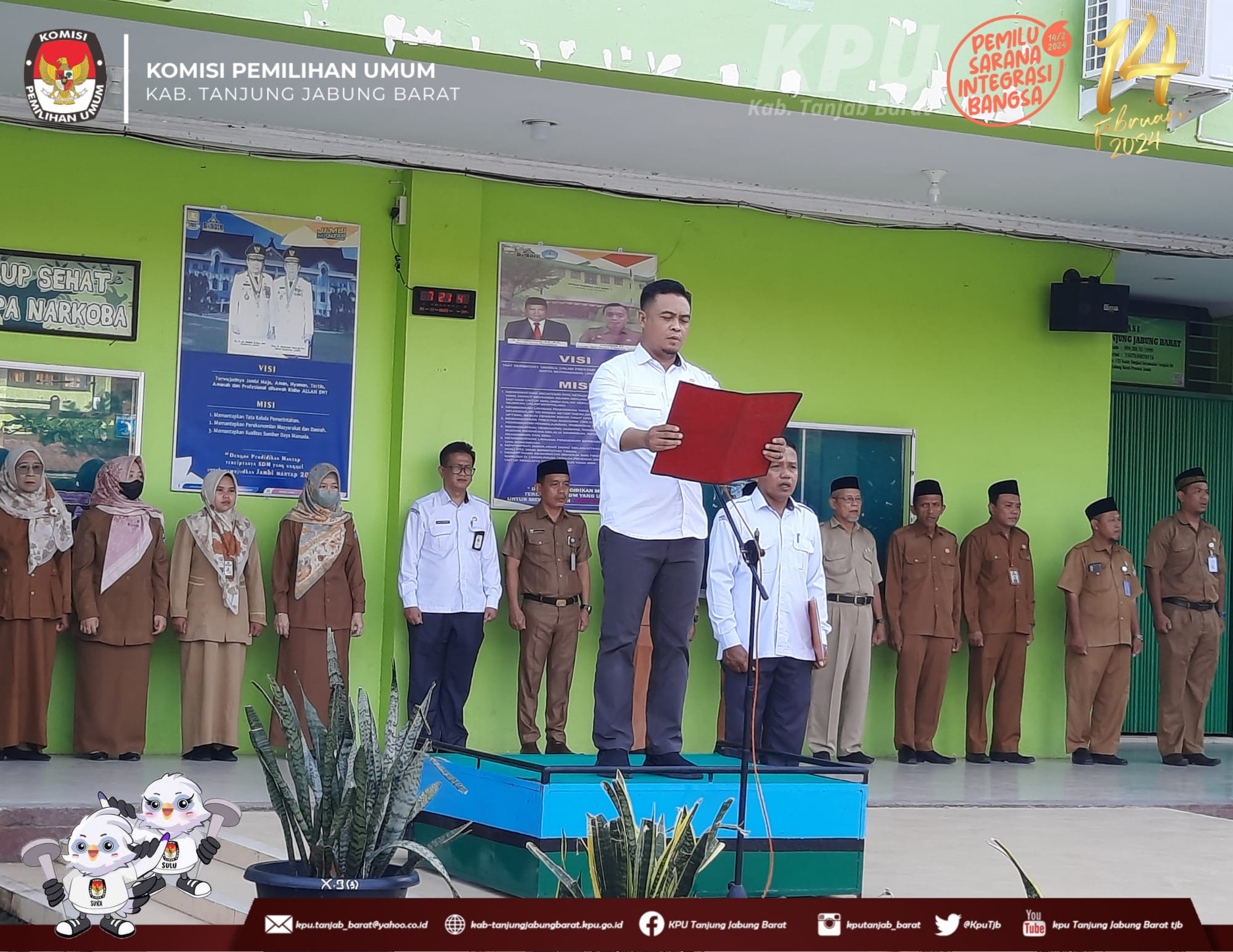 Menindaklanjuti Surat Edaran Sekretaris Jenderal Komisi Pemilihan Umum Nomor 11 Tahun 2023 tentang Optimalisasi Pelaksanaan Sosialisasi untuk meningkatkan Partisipasi Masyarakat dalam Penyelenggaraan Pemilu Tahun 2024, Serta Menindaklanjuti Surat Komisi Pemilihan Umum Provinsi Jambi Nomor : 944/PP.06/15/2023 Tanggal 3 November 2023 Perihal Optimalisasi Kegiatan Sosialisasi disekolah Anggota KPU Kabupaten Tanjung Jabung Barat melaksanakan Upacara Senin, 20 November 2023 di sekolah di Kabupaten tanjung Jabung Barat