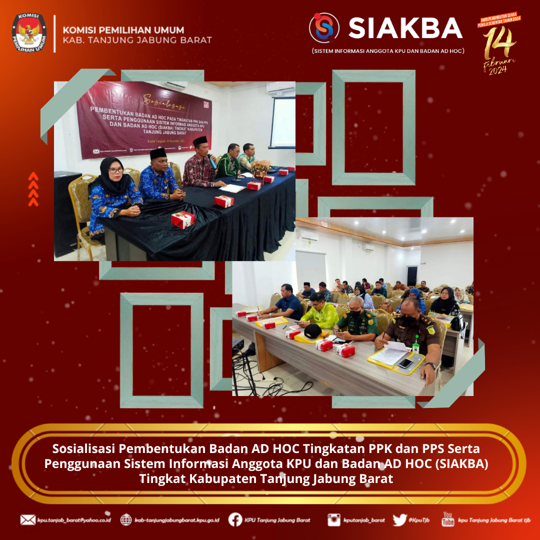 Komisi Pemilihan Umum (KPU) Kabupaten Tanjung Jabung Barat menggelar Sosialisasi Tahapan Pemilu, pembentukan badan Adhoc sekaligus penggunaan Aplikasi Sistem Informasi Anggota KPU dan Badan Adhock (SIAKBA) kepada Camat se-Kabupaten Tanjung Jabung Barat dan instansi terkait, Kamis (11/10/2022 ).