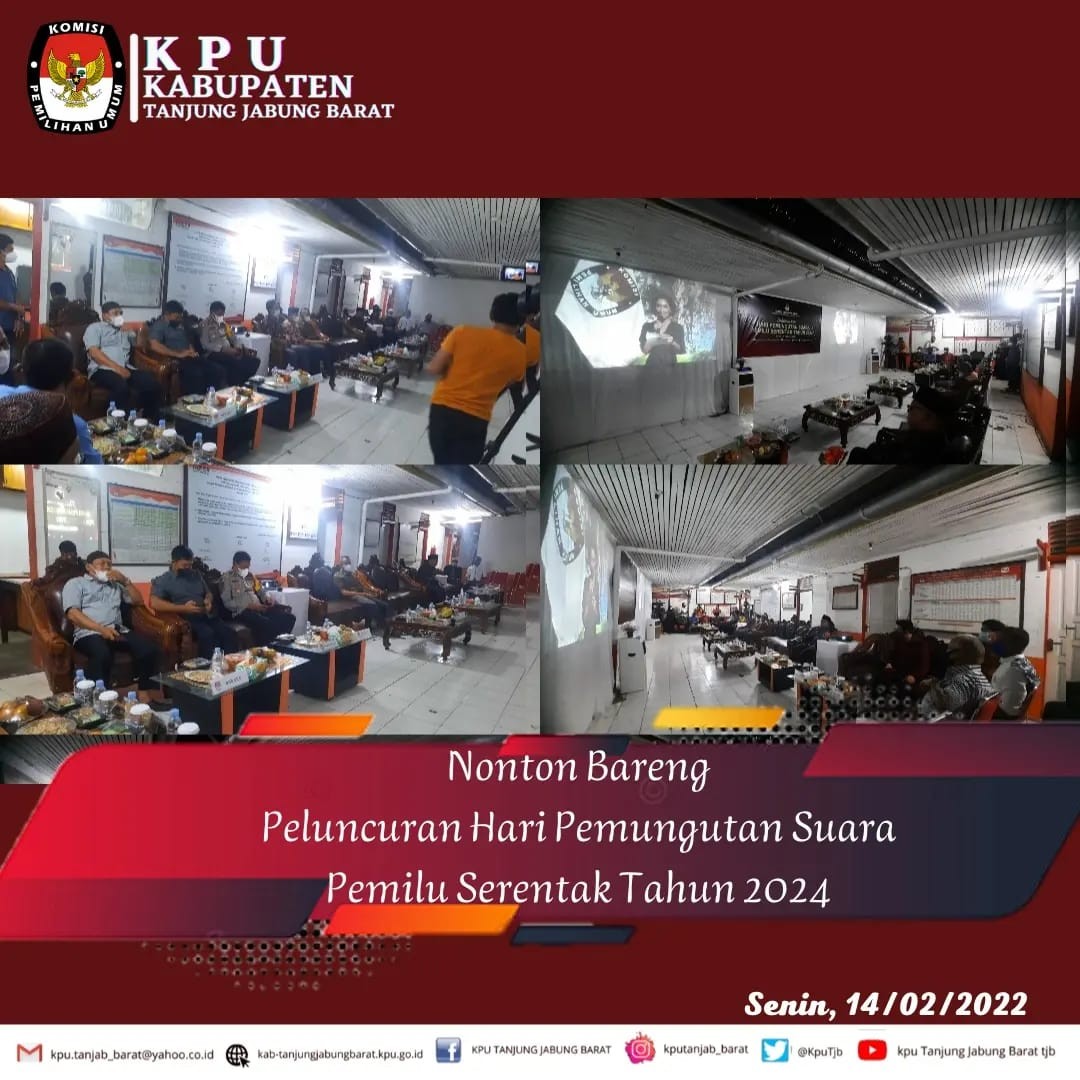 KPU Kabupaten Tanjung Jabung Barat mengadakan kegiatan Nonton Bareng, Peluncuran Hari dan Tanggal Pemungutan Suara Pemilu Serentak tahun 2024 yang diselenggarakan oleh KPU RI via daring, Senin (14/02). Kegiatan dilaksanakan di Aula Kantor KPU Kabupaten Tanjung Jabung Barat dengan diikuti oleh Forkopimda Kabupaten Tanjung Jabung Barat , Bawaslu Kabupaten Tanjung Jabung Barat , Partai Politik, dan Stakeholder terkait. Hari dan Tanggal Pemungutan Suara Pemilu Serentak Tahun 2024 telah ditetapkan yaitu Rabu, 14 Februari 2024.