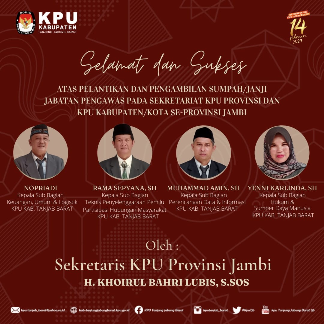 Selamat dan sukses atas pelantikan dan pengambilan sumpah/janji jabatan Pengawas pada KPU Kab. Tanjung Jabung Barat.