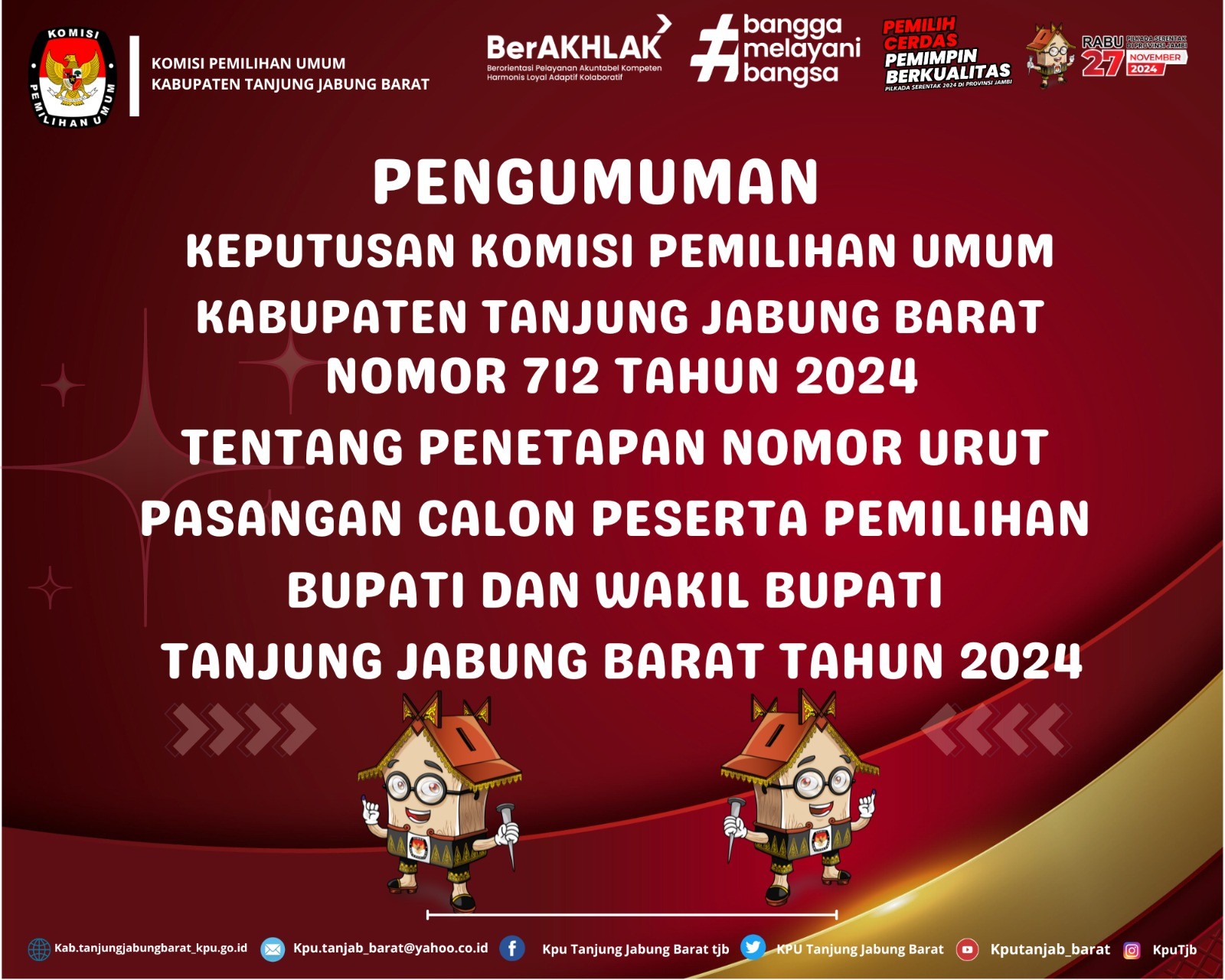 Komisi Pemilihan Umum Kabupaten Tanjung Jabung menetapkan Nomor Urut Pasangan Calon Peserta Pemilihan Bupati dan Wakil Bupati Kabupaten Tanjung Jabung Tahun 2024 sebagaimana tercantum dalam lampiran Keputusan Komisi Pemilihan Umum Kabupaten Tanjung Jabung Barat Nomor 712 Tahun 2024 tentang Penetapan Nomor Urut Pasangan Calon Peserta Pemilihan Bupati dan Wakil Bupati Tanjung Jabung Barat Tahun 2024.