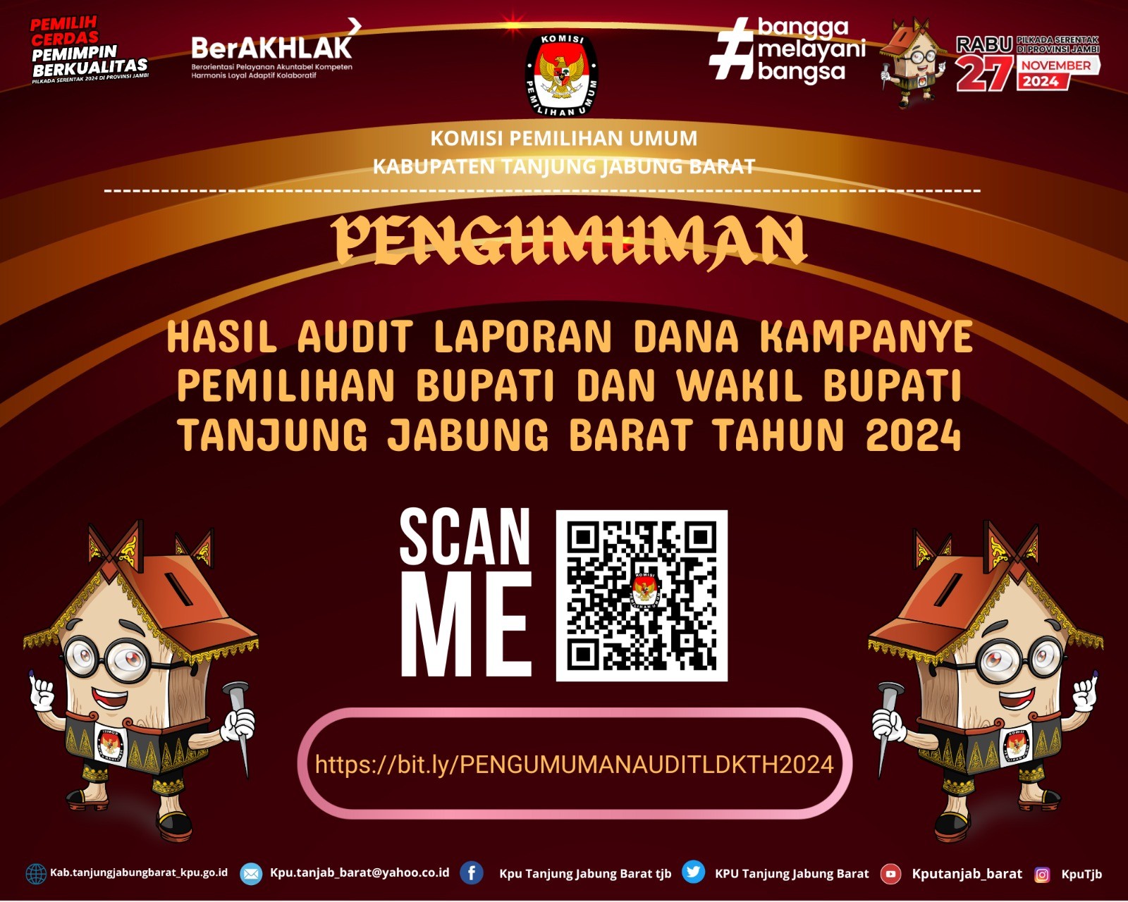 Teman Pemilih Berikut Link Pengumuman Audit Laporan Dana Kampanye Pemilihan Bupati dan Wakil Bupati Tanjung Jabung Barat Tahun 2024 silahkan Klik https://bit.ly/PENGUMUMANAUDITLDKTH2024