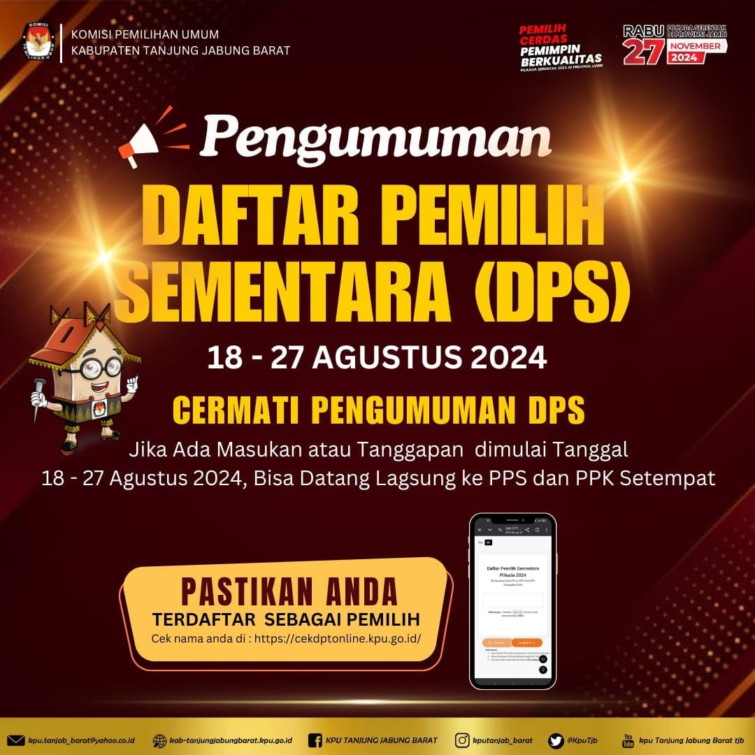 KPU Kabupaten Tanjung Jabung Barat, Panitia Pemilihan Kecamatan (PPK), dan Panitia Pemungutan Suara (PPS), terbuka menerima informasi dari #TemanPemilih yang belum mendaftarkan dirinya pada DPS sesuai KTP, Kartu Keluarga, Biodata Penduduk, dan IKD (Identitas Kependudukan Digital). Sampaikan ke KPU Kabupaten Tanjung Jabung Barat pada menu Kontak Kami dan kirim pesan pada nomor Whatsapp yang tersedia. Atau juga dapat menghubungi PPK di Kecamatan atau PPS di Desa/Kelurahan sesuai tempat tinggal #TemanPemilih