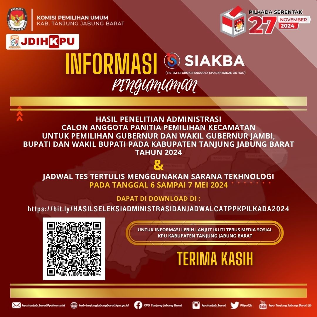 Berdasarkan Pengumuman Nomor 380/PP.04.2-Pu/1506/2024 tanggal 4 Mei 2024 tentang Penetapan Hasil Seleksi Penelitian Administrasi Calon Anggota Panitia Pemilihan Kecamatan untuk Pemilihan Gubernur dan Wakil Gubernur Jambi, Bupati dan Wakil Bupati Kabupaten Tanjung Jabung Barat Tahun 2024,