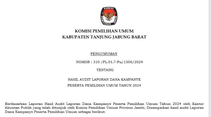UNDUH >>> PENGUMUMAN NO 310 HASIL AUDIT LAPORAN DANA KAMPANYE 2024 KAB TANJAB BARAT