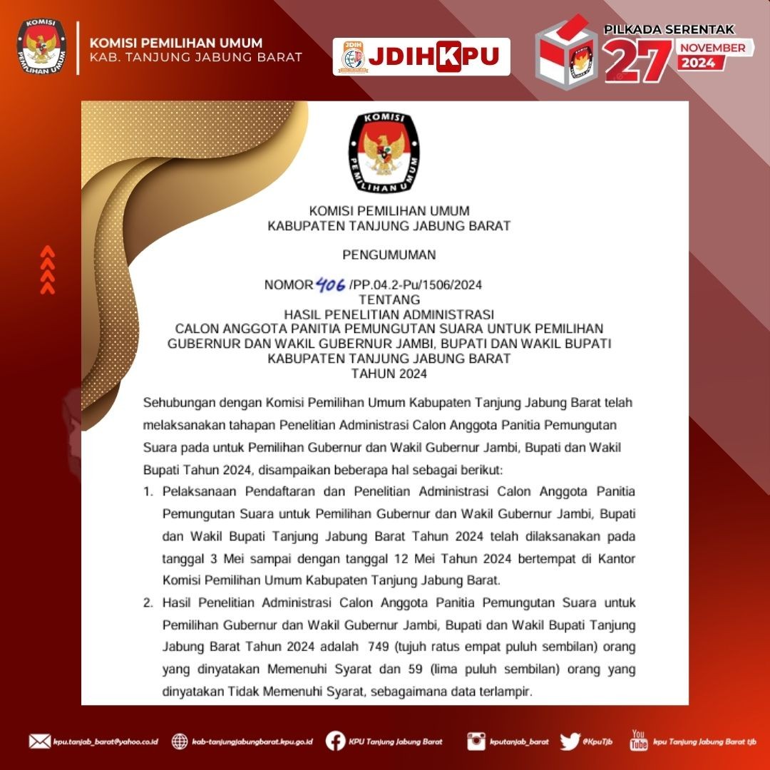 PENGUMUMAN NOMOR: 406/PP.04.2-Pu/1506/2024 TENTANG HASIL PENELITIAN ADMINISTRASI CALON ANGGOTA PANITIA PEMUNGUTAN SUARA UNTUK PEMILIHAN GUBERNUR DAN WAKIL GUBERNUR JAMBI, BUPATI DAN WAKIL BUPATI KABUPATEN TANJUNG JABUNG BARAT TAHUN 2024