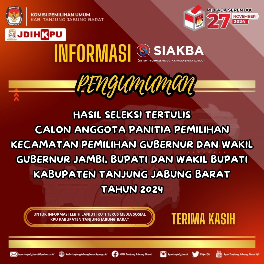 PENGUMUMAN HASIL SELEKSI TERTULIS CALON ANGGOTA PANITIA PEMILIHAN KECAMATAN PEMILIHAN GUBERNUR DAN WAKIL GUBERNUR JAMBI, BUPATI DAN WAKIL BUPATI KABUPATEN TANJUNG JABUNG BARAT TAHUN 2024