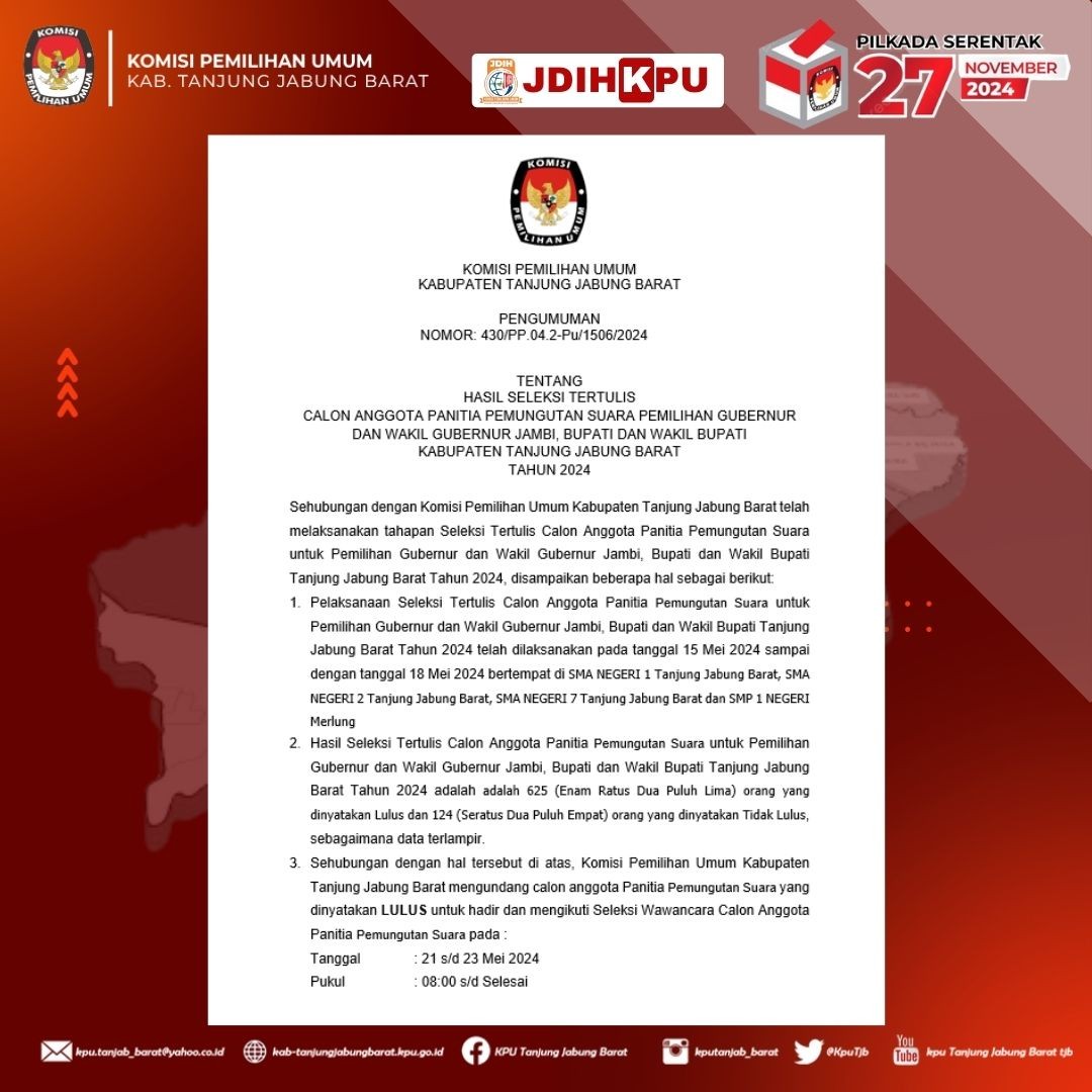 PENGUMUMAN NOMOR: 430/PP.04.2-Pu/1506/2024 TENTANG HASIL SELEKSI TERTULIS CALON ANGGOTA PANITIA PEMUNGUTAN SUARA PEMILIHAN GUBERNUR DAN WAKIL GUBERNUR JAMBI, BUPATI DAN WAKIL BUPATI KABUPATEN TANJUNG JABUNG BARAT TAHUN 2024