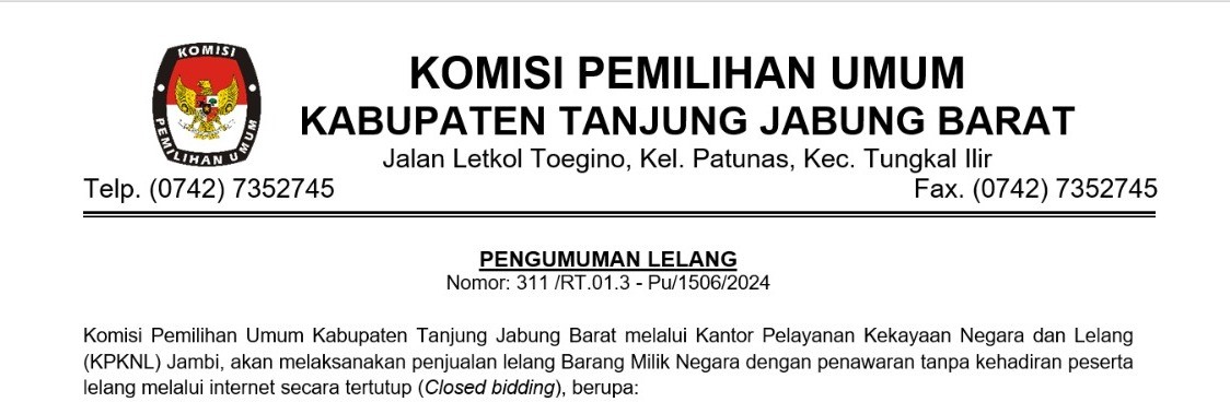 Komisi Pemilihan Umum Kabupaten Tanjung Jabung Barat melalui Kantor Pelayanan Kekayaan Negara dan Lelang (KPKNL) Jambi, akan menyelenggarakan penjualan lelang Barang Milik Negara dengan penawaran tanpa kehadiran peserta lelang melalui internet secara tertutup (Closed bidding).