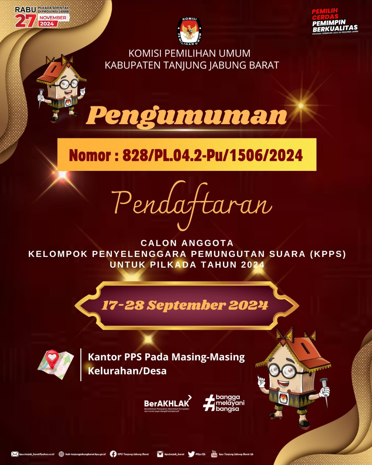 Dalam rangka pembentukan KPPS untuk Pemilihan Gubernur dan Wakil Gubernur, Bupati dan Wakil Bupati Tahun 2024, Komisi Pemilihan Umum Kabupaten Tanjung Jabung Barat mengundang Warga Negara Indonesia yang memenuhi persyaratan untuk mendaftarkan diri menjadi anggota KPPS untuk Pemilihan Serentak dengan ketentuan sebagai berikut: