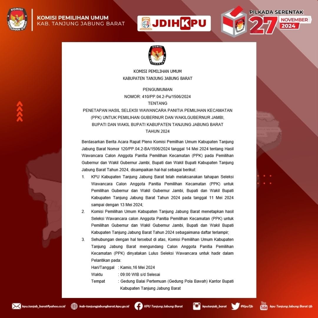 PENGUMUMAN NOMOR: 410/PP.04.2-Pu/1506/2024 TENTANG PENETAPAN HASIL SELEKSI WAWANCARA PANITIA PEMILIHAN KECAMATAN (PPK) UNTUK PEMILIHAN GUBERNUR DAN WAKILGUBERNUR JAMBI, BUPATI DAN WAKIL BUPATI KABUPATEN TANJUNG JABUNG BARAT TAHUN 2024