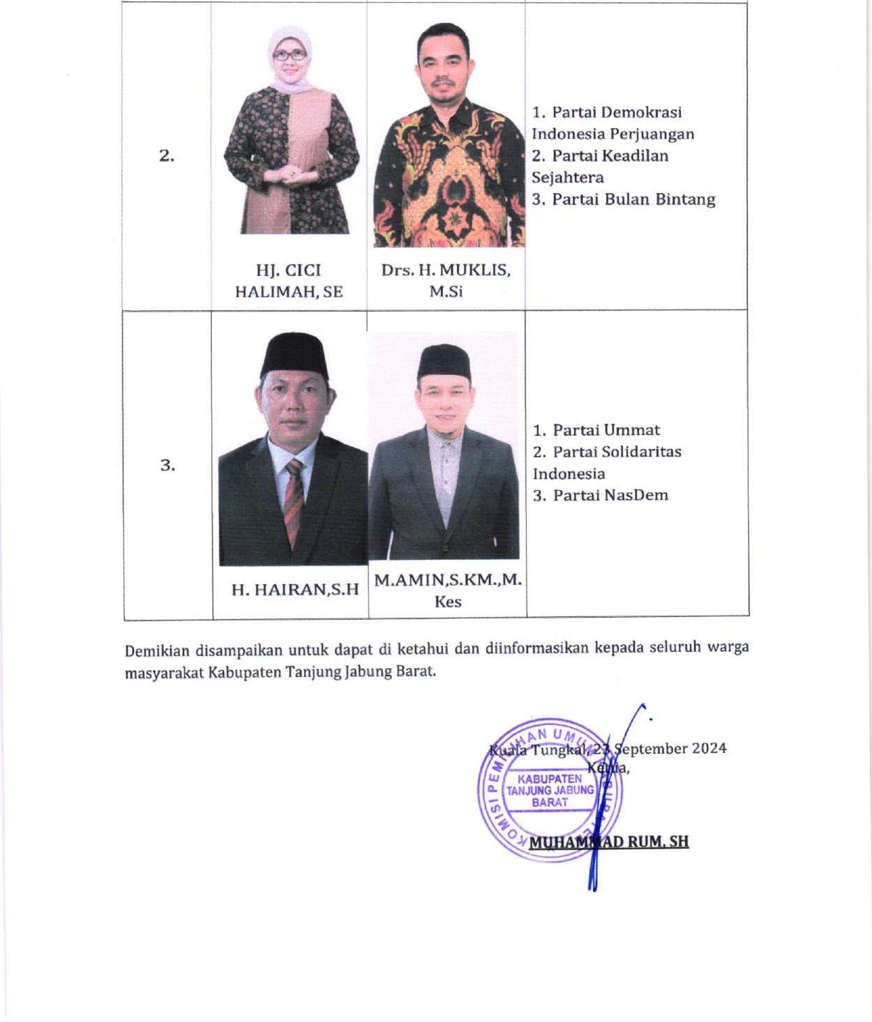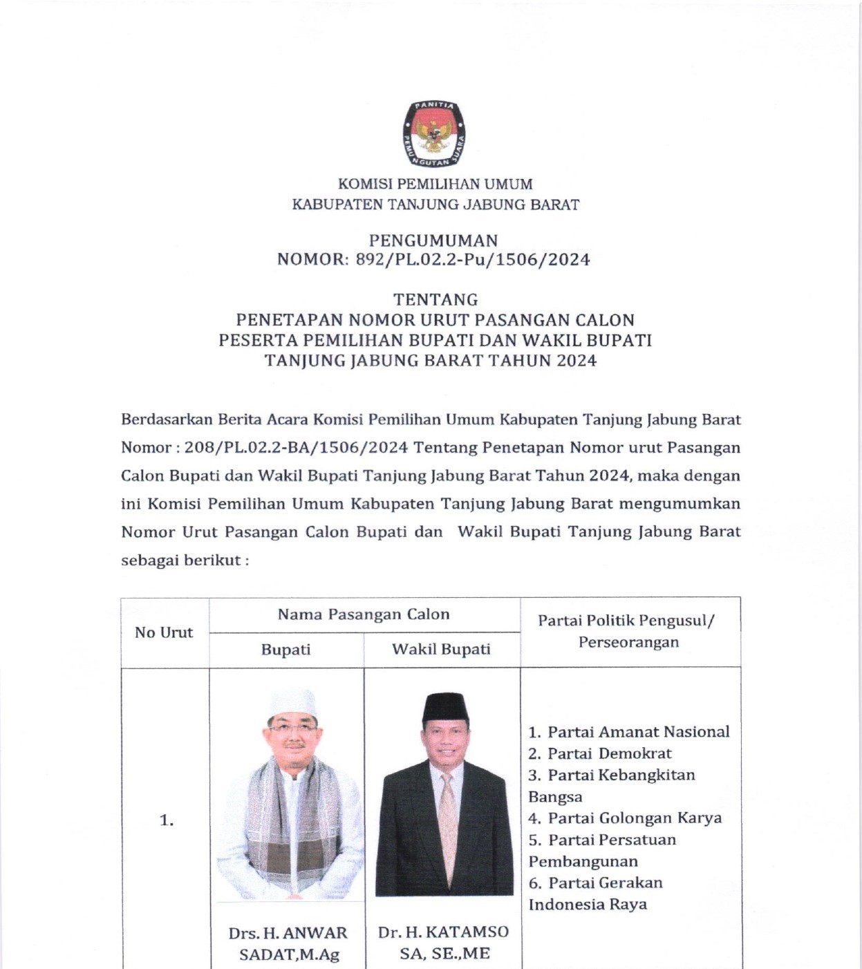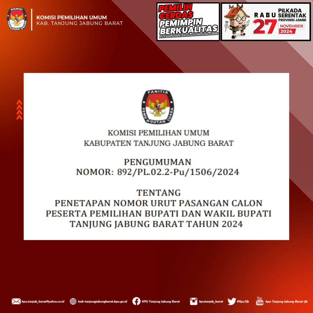 PENGUMUMAN PENETAPAN NOMOR URUT PASANGAN CALON PESERTA PEMILIHAN BUPATI DAN WAKIL BUPATI TANJUNG JABUNG BARAT TAHUN 2024