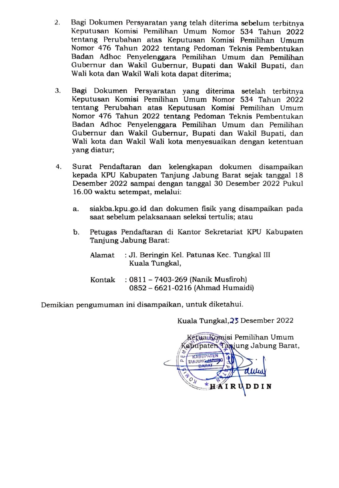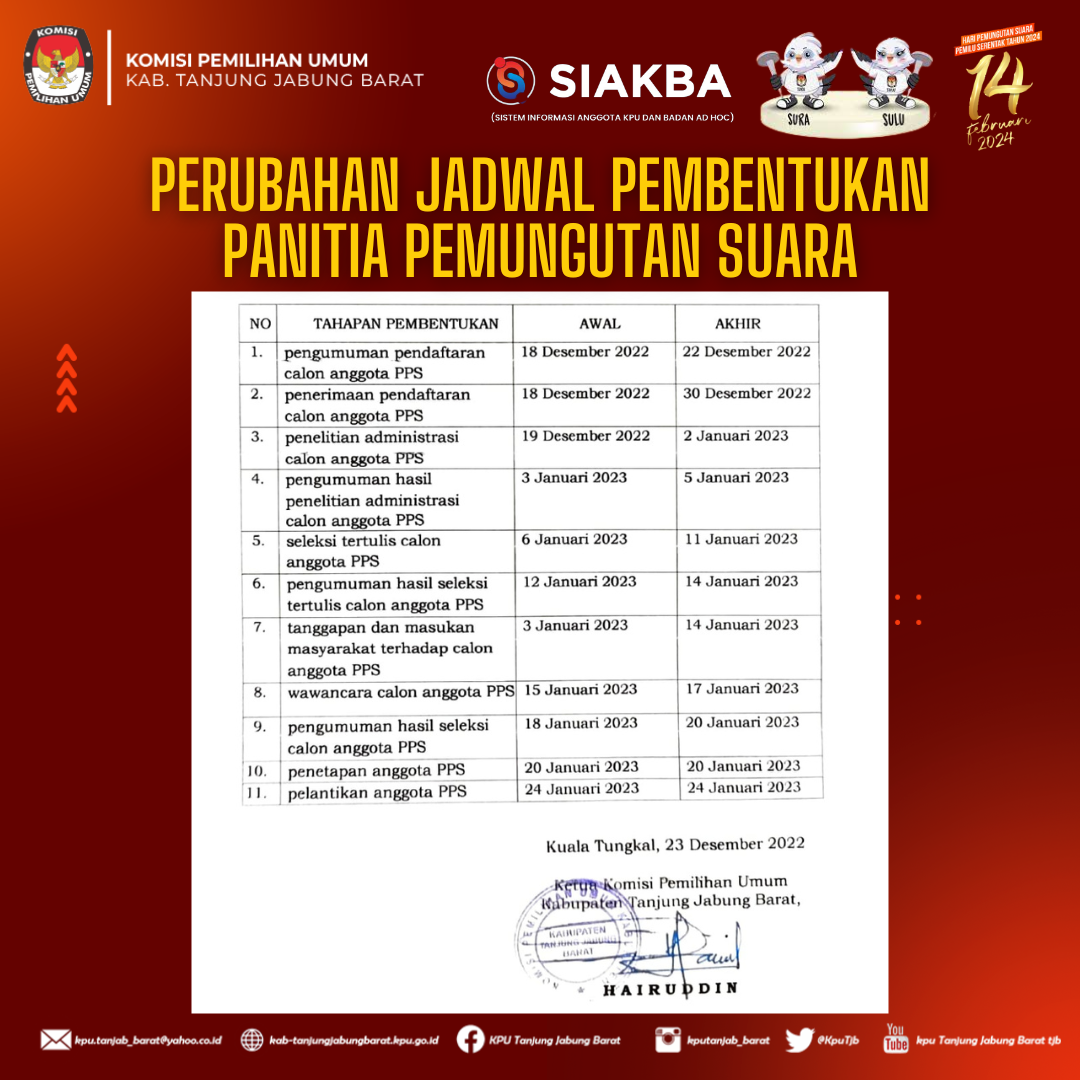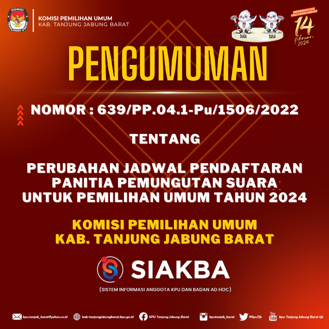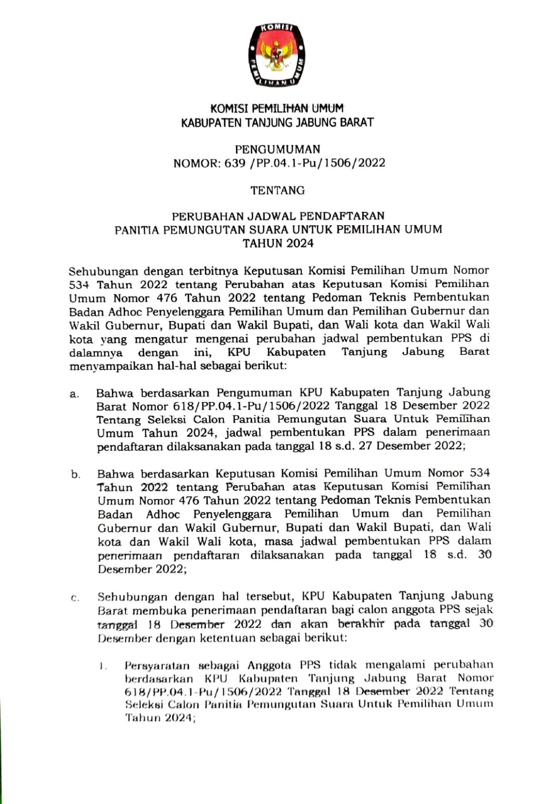 Sehubungan dengan terbitnya Keputusan Komisi Pemilihan Umum Nomor 534 Tahun 2022 tentang Perubahan atas Keputusan Komisi Pemilihan Umum Nomor 476 Tahun 2022 tentang Pedoman Teknis Pembentukan Badan Adhoc Penyelenggara Pemilihan Umum dan Pemilihan Gubernur dan Wakil Gubernur, Bupati dan Wakil Bupati, dan Walikota dan Wakil Walikota yang mengatur mengenai peruahan jadwal pembentukan PPS di dalamnya dengan ini, KPU Kabupaten Tanjung Jabung Barat menyampaikan hal-hal sebagai berikut: