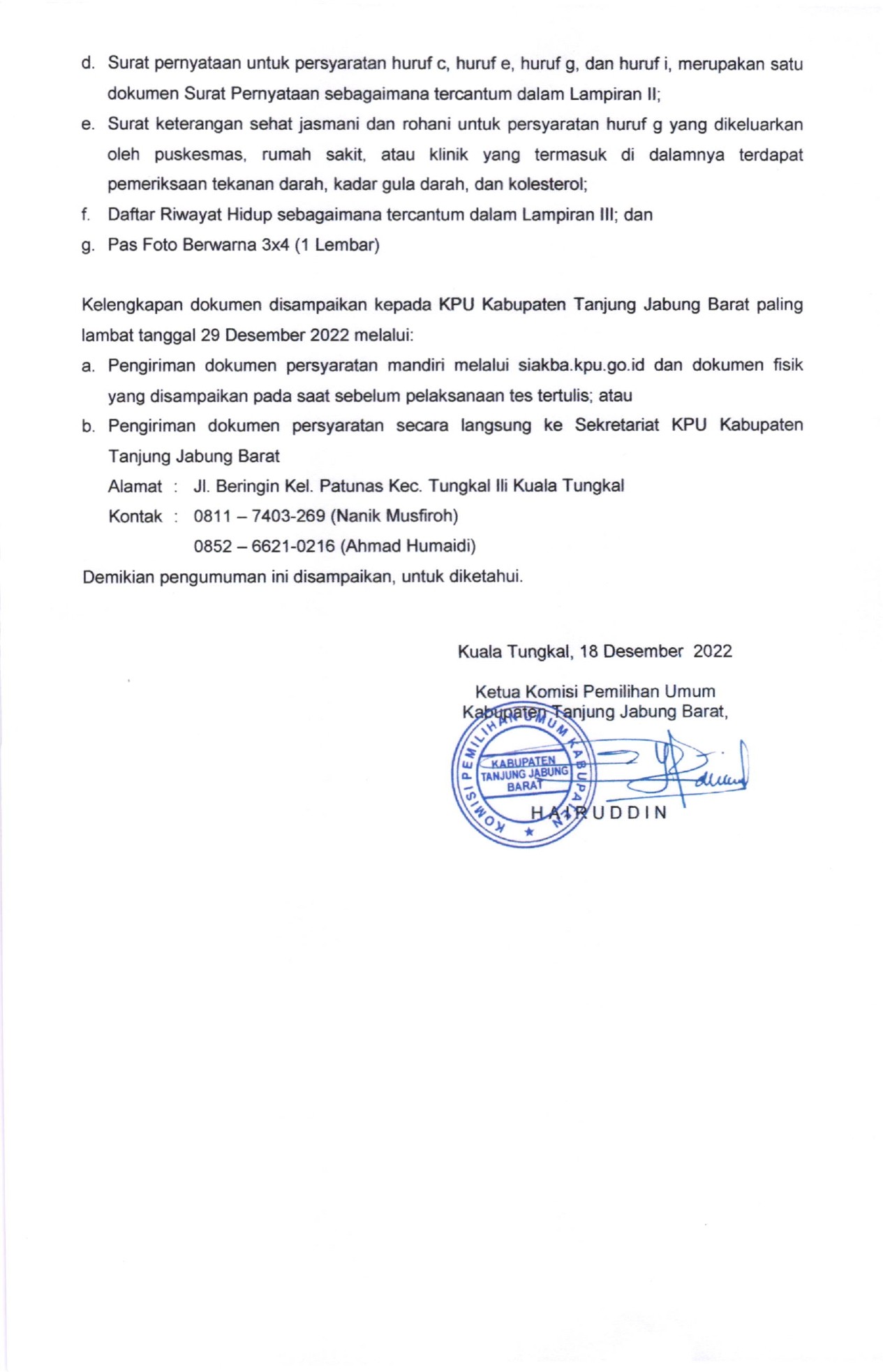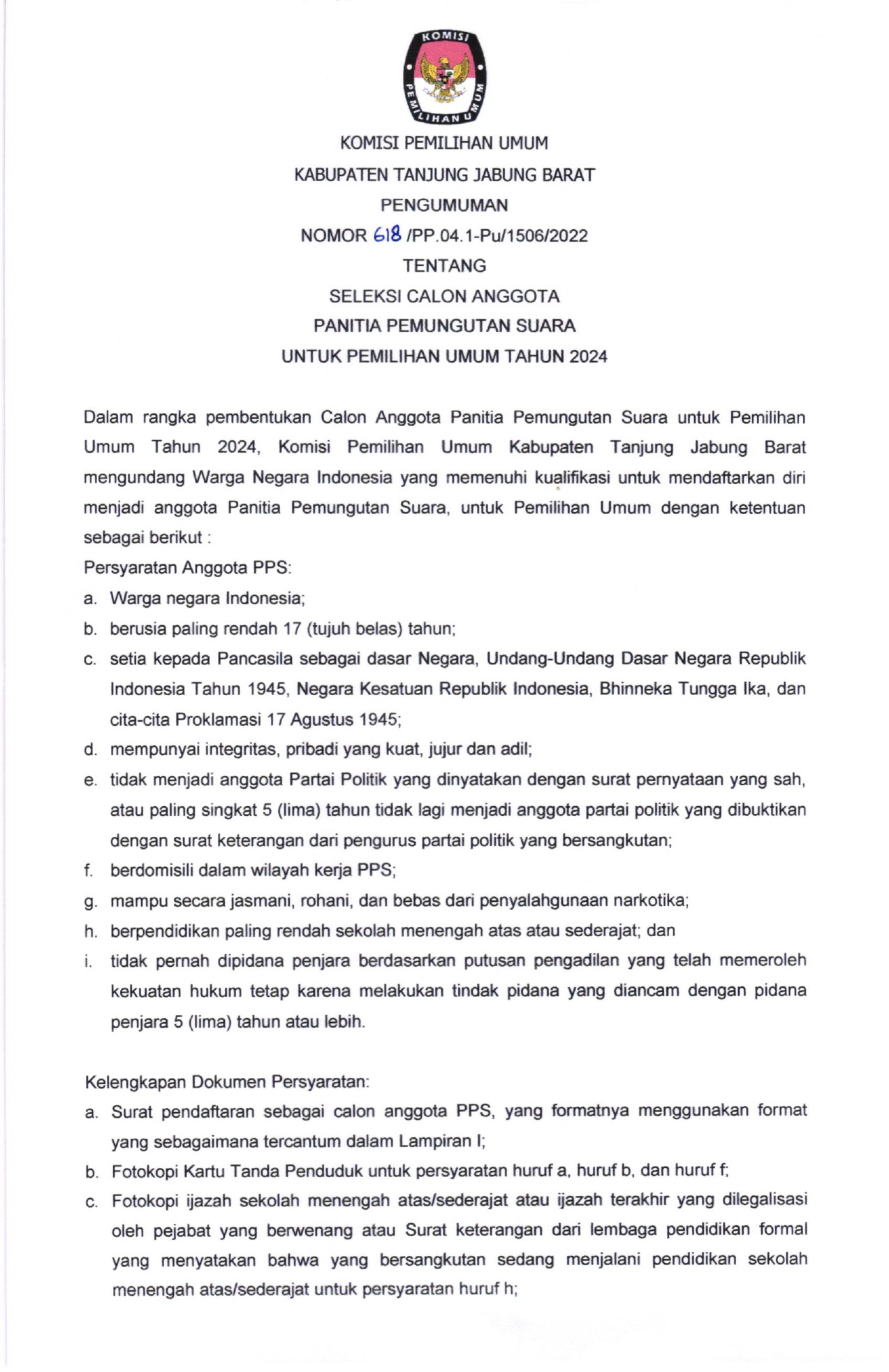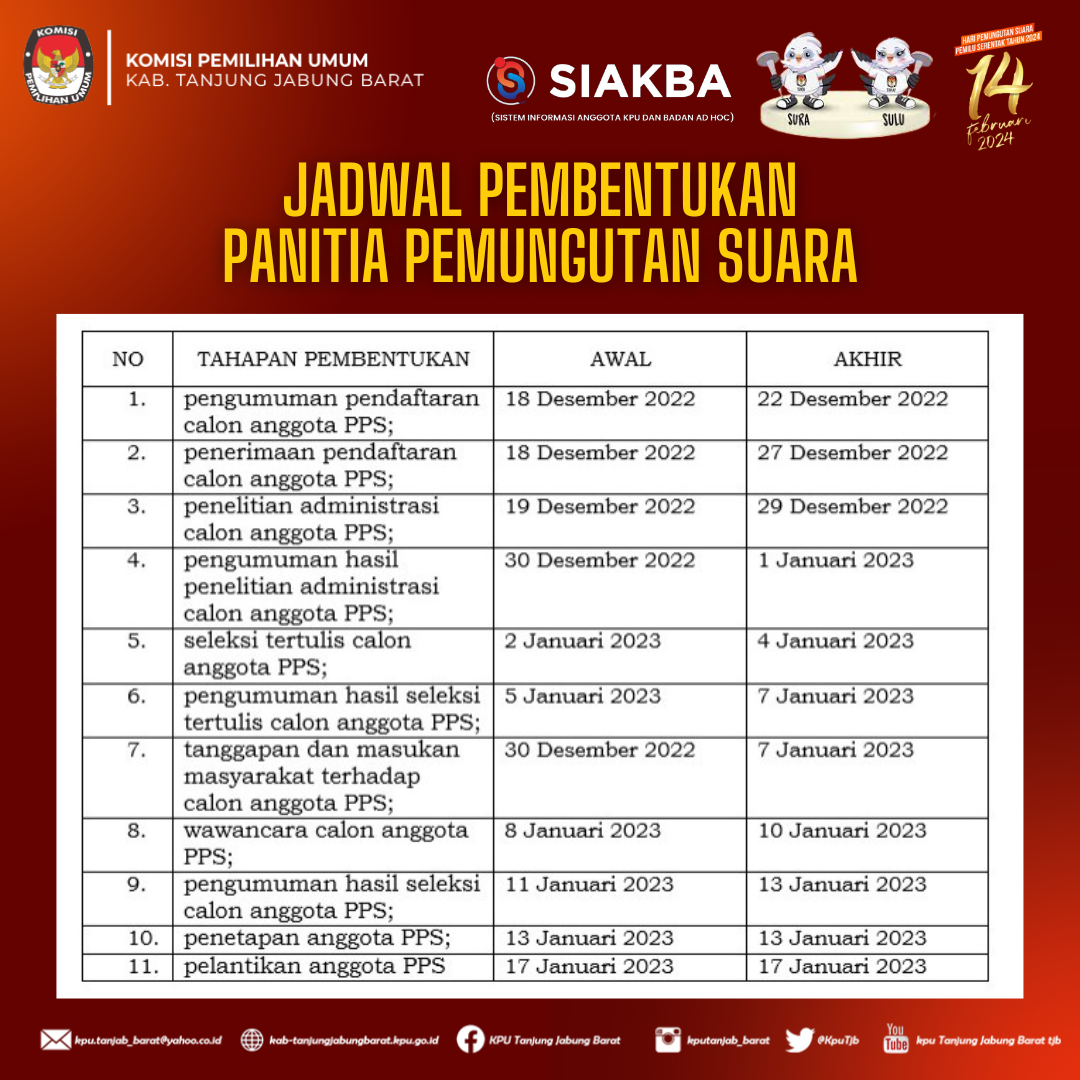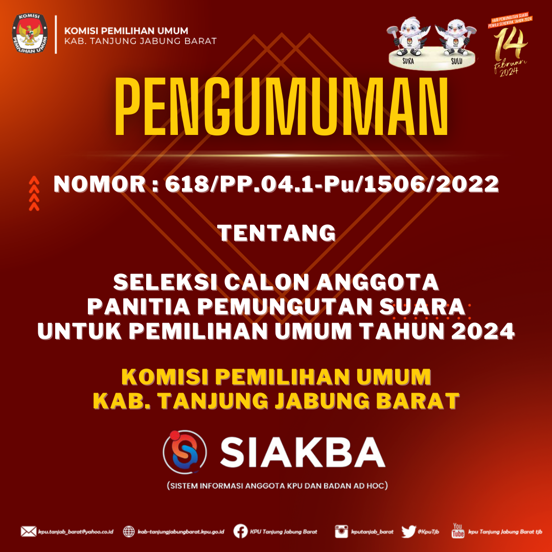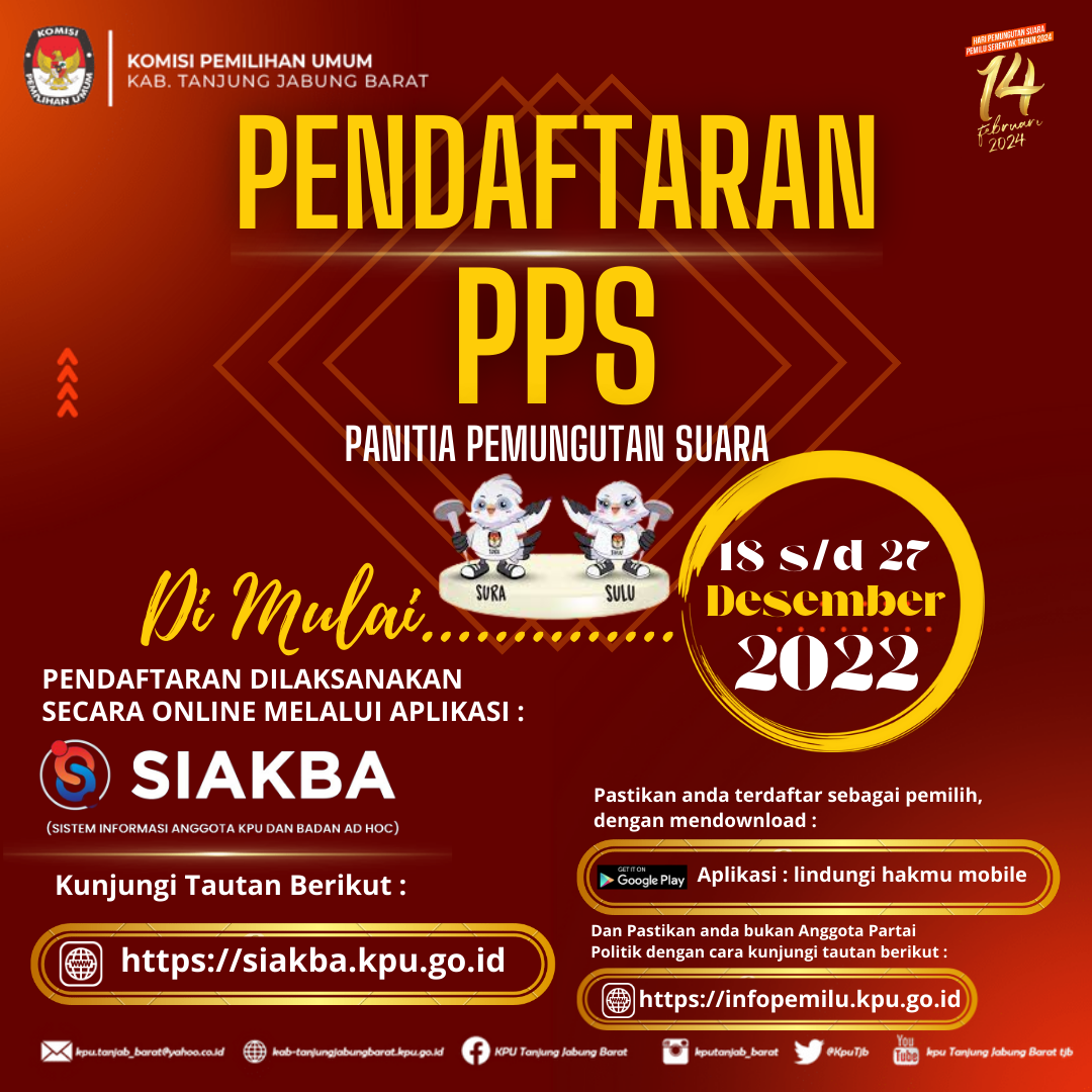 Dalam rangka pembentukan badan Ad Hoc Calon Anggota Panitia Pemungutan Suara (PPS), Komisi Pemilihan Umum Kabupaten Tanjung Jabung Barat mengundang Warga Negara Indonesia yang berdomisili di Kabupaten Tanjung Jabung Barat dan memenuhi kualifikasi untuk mendaftarkan diri menjadi anggota Panitia Pemungutan Suara (PPS).Penerimaan pendaftaran calon anggota PPS di mulai tanggal 18 sampai dengan 27 Desember 2022.