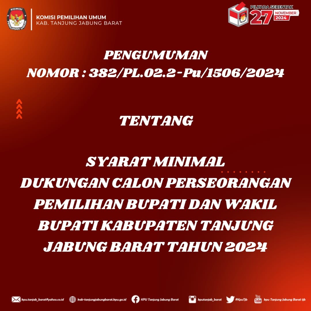 PENGUMUMAN SYARAT MINIMAL DUKUNGAN CALON PERSEORANGAN PEMILIHAN BUPATI DAN WAKIL BUPATI KABUPATEN TANJUNG JABUNG BARAT TAHUN 2024