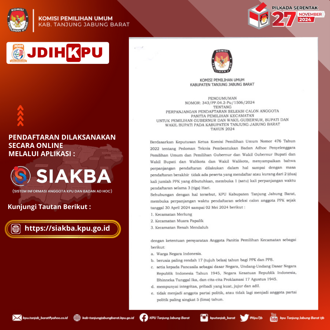 PERPANJANGAN PENDAFTARAN SELEKSI CALON ANGGOTA PANITIA PEMILIHAN KECAMATAN UNTUK PEMILIHAN GUBERNUR DAN WAKIL GUBERNUR, BUPATI DAN WAKIL BUPATI PADA KABUPATEN TANJUNG JABUNG BARAT TAHUN 2024