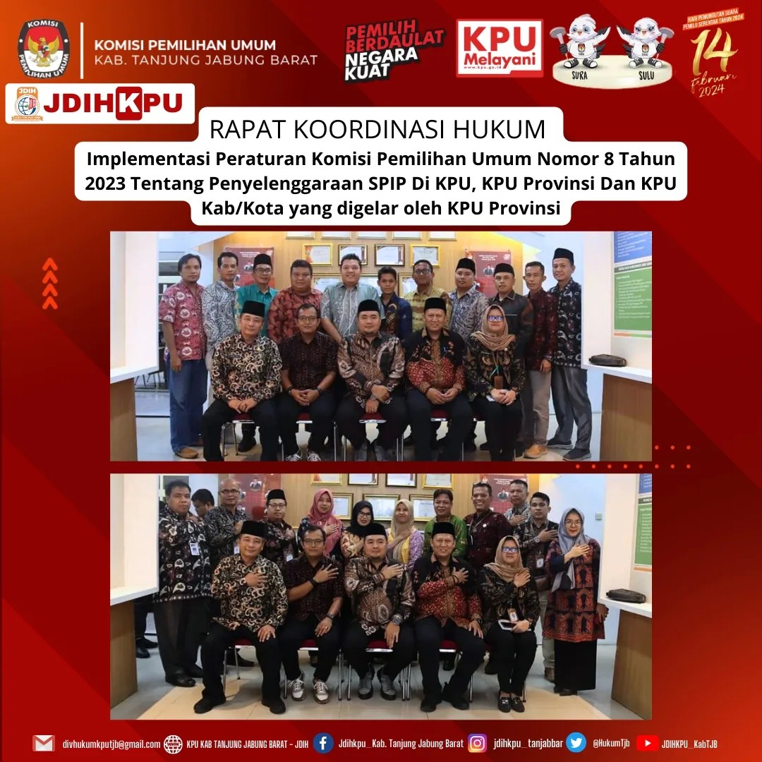 Komisi Pemilihan Umum (KPU) Kabupaten Tanjung Jabung Barat Mengikuti Rapat Koordinasi Hukum Implementasi Peraturan Komisi Pemilihan Umum Nomor 8 TRapat Koordinasi Hukum PKPU Nomor 8 Tahun 2023ahun 2023 Tentang Penyelenggaraan SPIP Di KPU, KPU Provinsi Dan KPU Kab/Kota yang digelar oleh KPU Provinsi Jambi Jumat, (14/07/2023). Rakor tersebut menghadirkan pembicara Anggota KPU RI Divisi Hukum dan Pengawasan Mochammad Afifuddin dan dipandu oleh Anggota KPU Provinsi Jambi Divisi Hukum dan Pengawasan Suparmin. Dalam kegiatan tersebut Anggota KPU RI Divisi Hukum dan Pengawasan, Mochammad Afifuddin, memaparkan materi Implementasi Sistem Pengendalian Intern Pemerintah Di Lingkungan KPU Kabupaten/Kota se-Jambi. Menurutnya, sistem pengendalian intern merupakan sistem yang penting diterapkan. Untuk menerapkan sistem tersebut, pengendalian intern harus dilakukan secara berjenjang mulai dari KPU RI, KPU Provinsi hingga KPU Kabupaten/Kota.