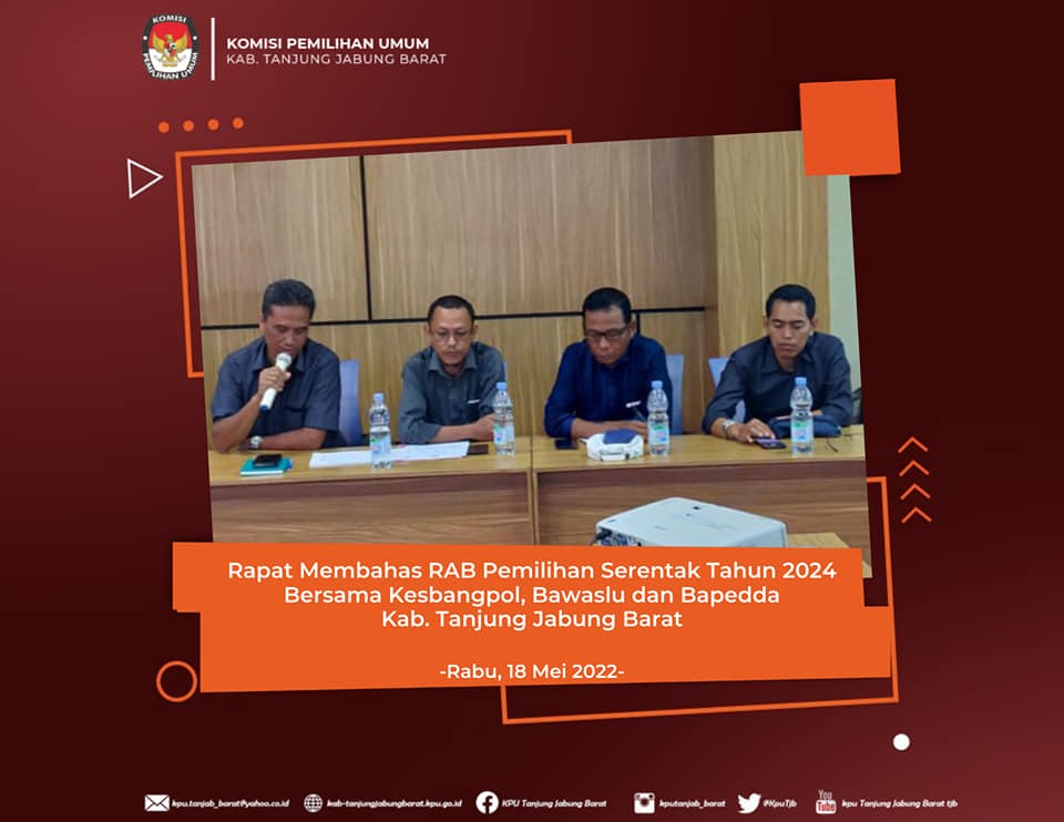 Dalam pelaksanaan Rapat Koordinasi tersebut Bapak HAIRUDDIN, S.Sos Selaku Ketua KPU Kabupaten Tanjung Jabung Barat, Menyampaikan usulan Rencana Anggaran Biaya (RAB) Pemilihan Kepala Daerah Serentak Tahun 2024 Kabupaten Tanjung Jabung Barat Melalui Badan Kesatuan Pembangunan Bangsa dan Politik (KESBANGPOL).