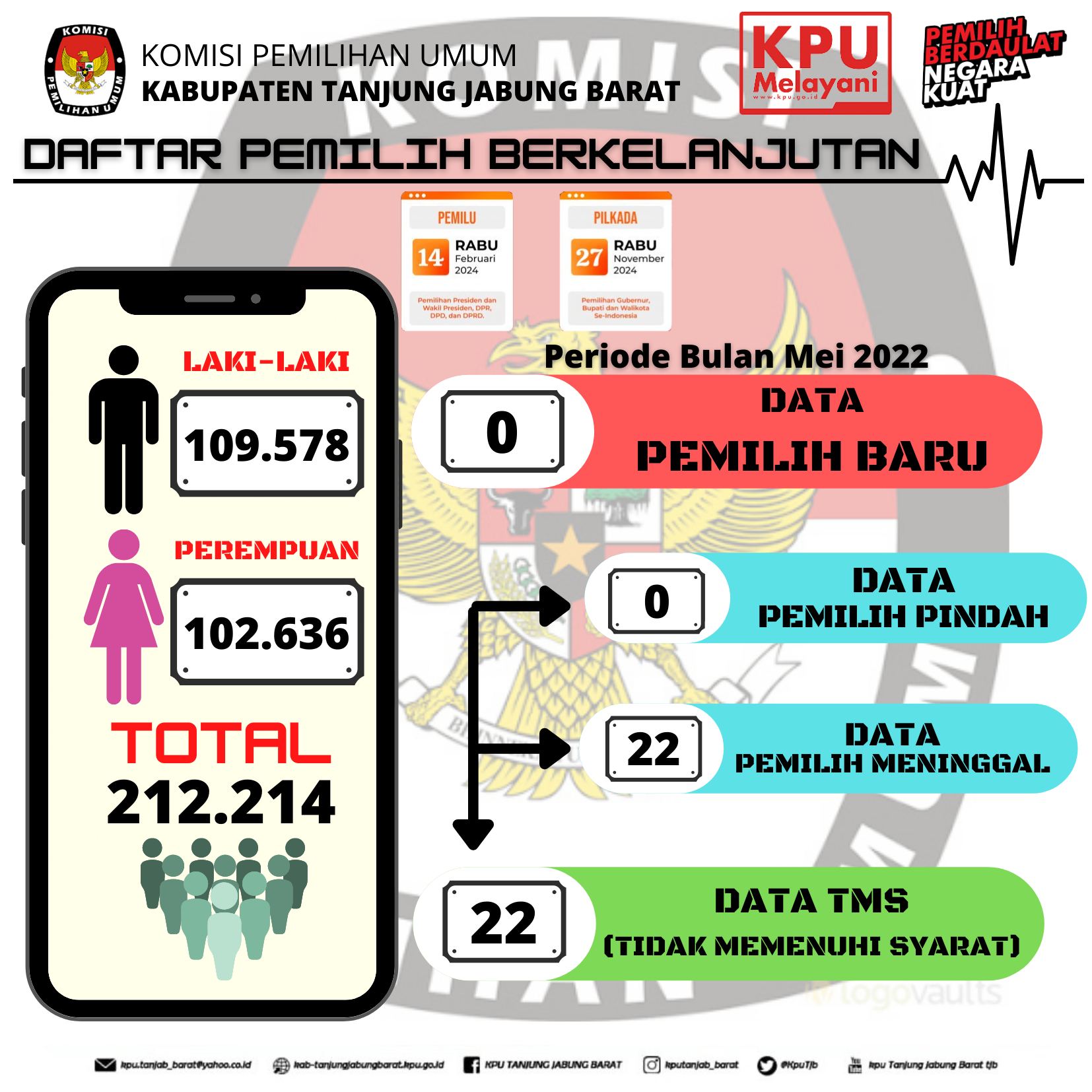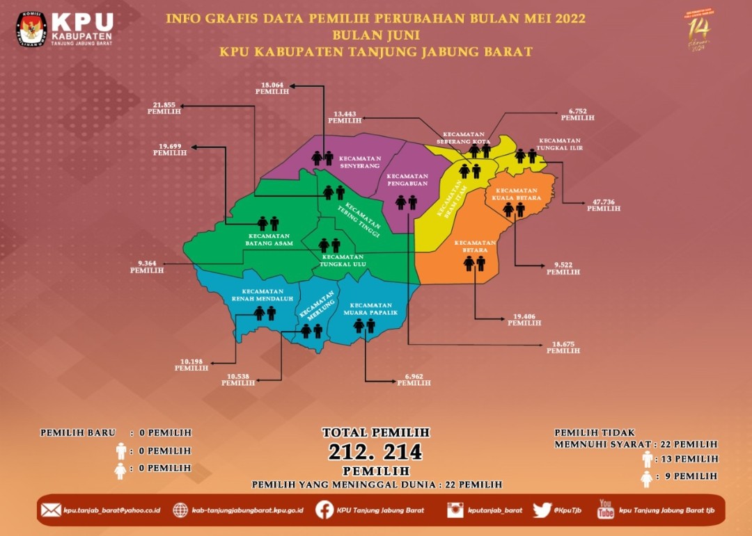 Berdasarkan ketentuan Peraturan Komisi Pemilihan Umum Nomor 6 tanggal 11 bulan November tahun 2021 perihal Pemutakhiran Data Pemilih Berkelanjutan, hasil Rapat Pleno yang dilakukan oleh KPU Kabupaten Tanjung Jabung Barat menghasilkan hal sebagai berikut, yaitu Pemilih Tidak Memenuhi Syarat dengan jumlah sebanyak 22 (Dua Puluh Dua) pemilih dengan rincian pemilih laki-laki berjumlah 13 (Tiga Belas) pemilih dan pemilih perempuan berjumlah 9 (Sembilan) pemilih, tersebar di 13 (Tiga Belas) Kecamatan.
