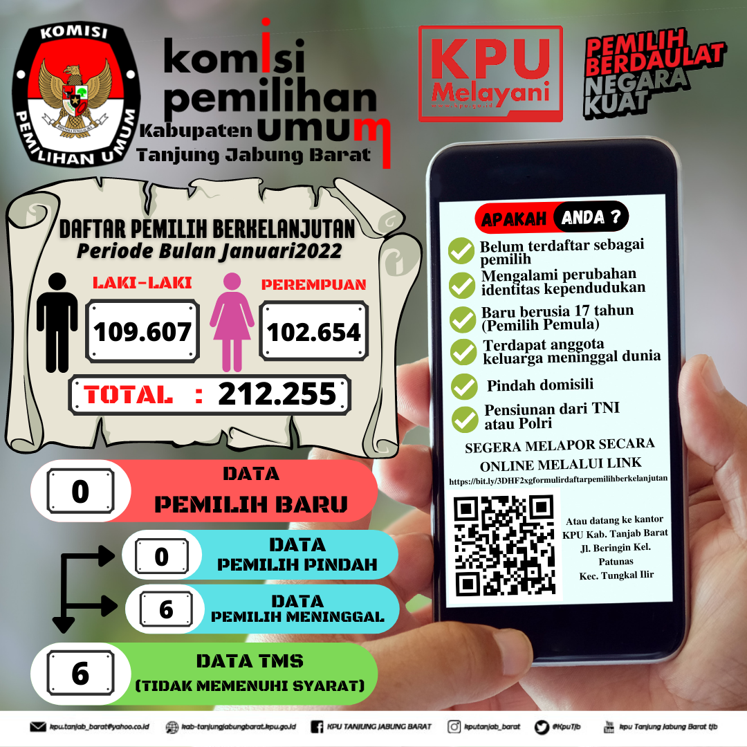 Berdasarkan ketentuan Peraturan Komisi Pemilihan Umum Nomor 6 tanggal 11 bulan November tahun 2021 perihal Pemutakhiran Data Pemilih Berkelanjutan, hasil Rapat Pleno yang dilakukan oleh KPU Kabupaten Tanjung Jabung Barat menghasilkan hal sebagai berikut, yaitu Pemilih Tidak Memenuhi Syarat dengan jumlah sebanyak 6 (Enam) pemilih dengan rincian pemilih laki-laki berjumlah 4 (Empat) pemilih dan pemilih perempuan berjumlah 2 (Dua) pemilih, tersebar di 13 (Tiga Belas) Kecamatan.