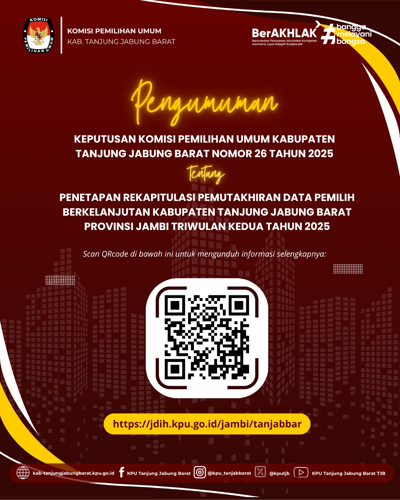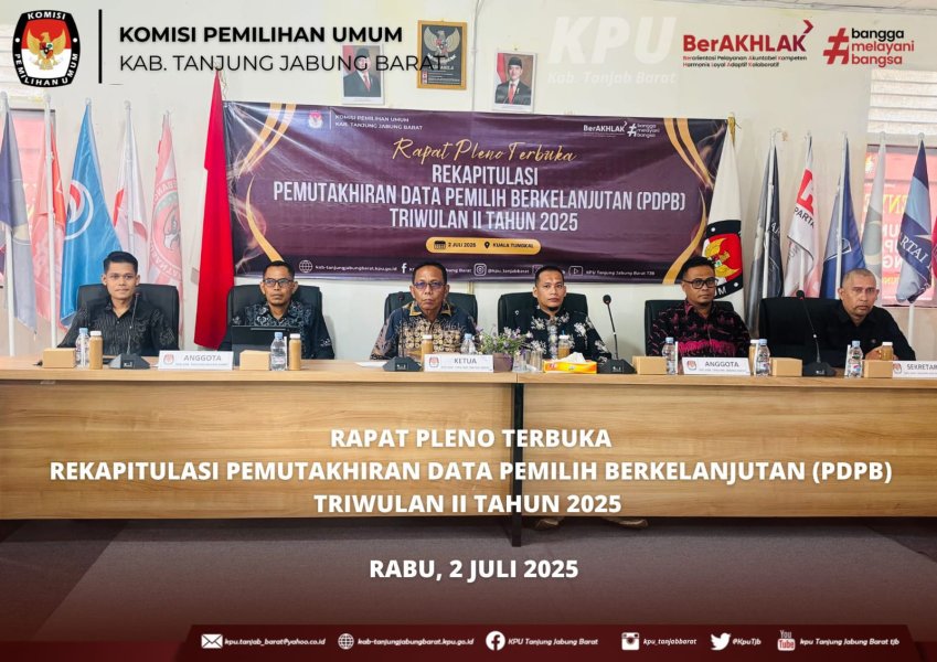#TemanPemilih , Rabu, 2 Juli 2025, KPU Kabupaten Tanjung Jabung Barat mengadakan Rapat Pleno Terbuka Rekapitulasi Pemutakhiran Data Pemilih Berkelanjutan (PDPB) yang menghasilkan Keputusan Komisi Pemilihan Umum Kabupaten Tanjung Jabung Barat Nomor 26 Tahun 2025.