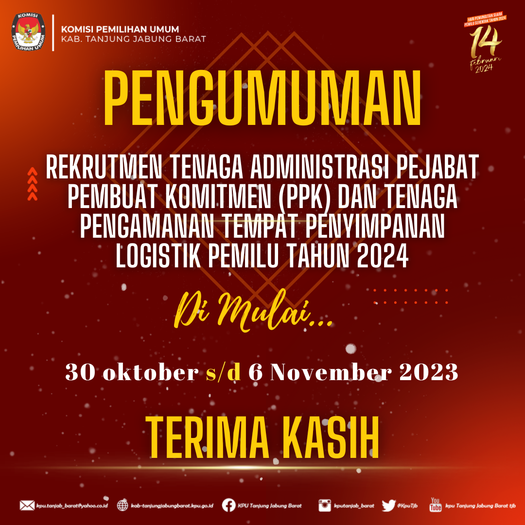 Komisi Pemilihan Umum Kabupaten Tanjung Jabung Barat , memberikan kesempatan kepada putra-putri bangsa terbaik untuk melamar dalam Rekrutmen Tenaga Administrasi Pejabat Pembuat Komitmen (PPK) Dan Tenaga Pengamanan Tempat Penyimpanan Logistik Pemilu Tahun 2024.