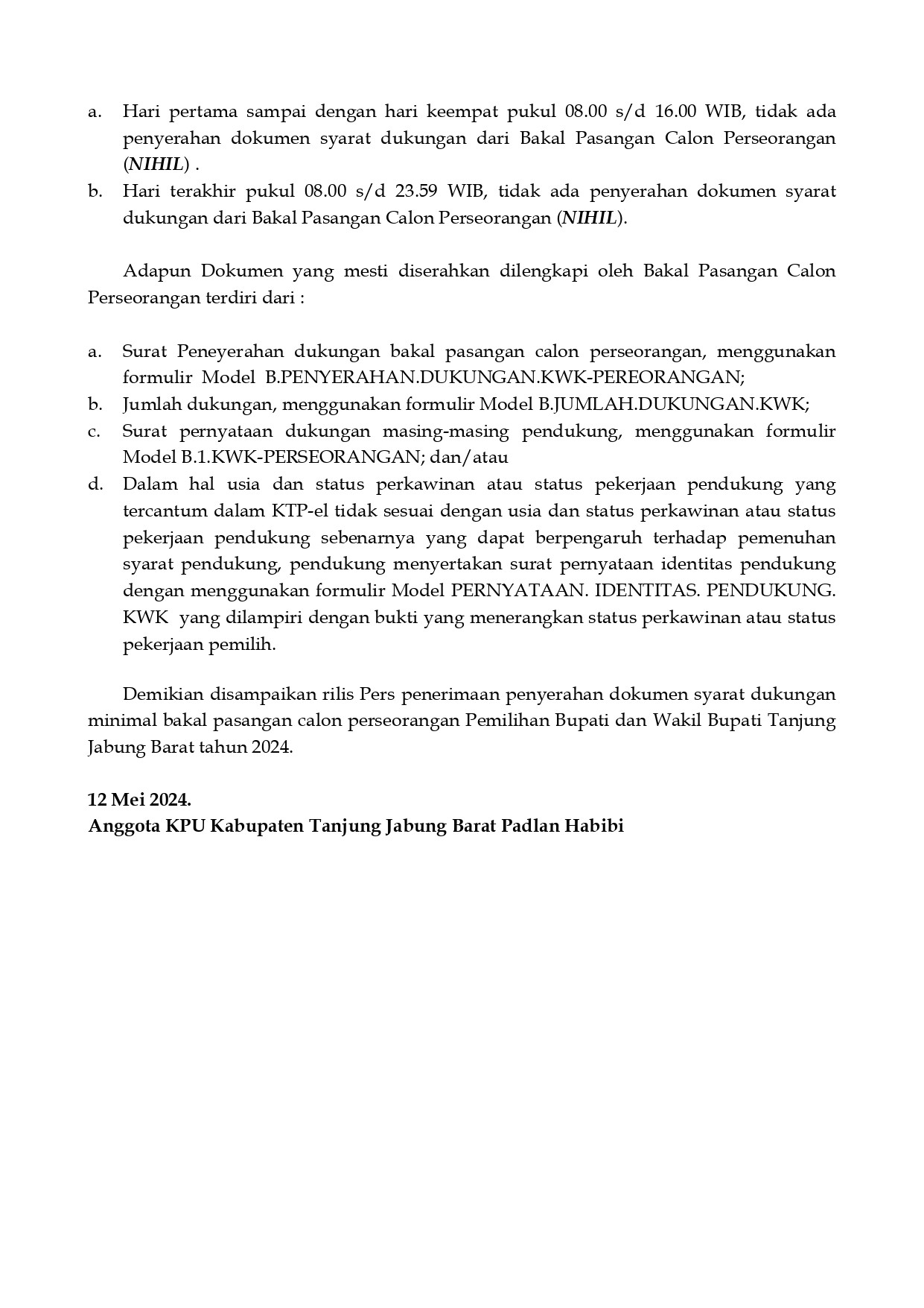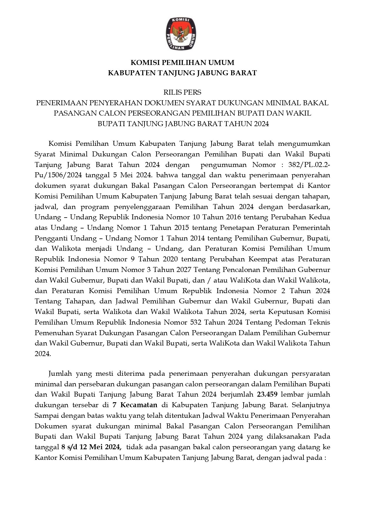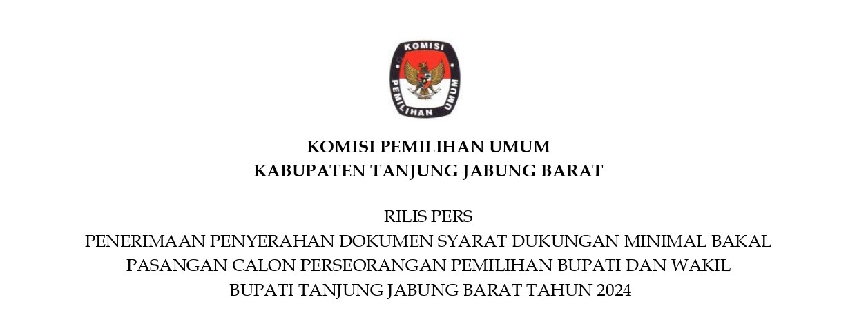 RILIS PERS PENERIMAAN PENYERAHAN DOKUMEN SYARAT DUKUNGAN MINIMAL BAKAL PASANGAN CALON PERSEORANGAN PEMILIHAN BUPATI DAN WAKIL BUPATI TANJUNG JABUNG BARAT TAHUN 2024
