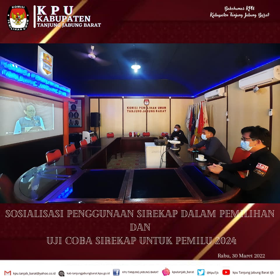 Sekretaris KPU Kabupaten Tanjung Jabung Barat beserta Kasubbag Divisi Teknis Penyelenggara Pemilu Partisipasi Hubungan Masyarakat dan Staf mengikuti Live Streaming Sosialisasi Penggunaan Sirekap dalam Pemilihan dan Uji Coba Sirekap untuk Pemilu Tahun 2024 yang dilaksanakan oleh KPU Republik Indonesia Rabu, 30 Maret 2022 pukul 13.30 s/d Selesai.